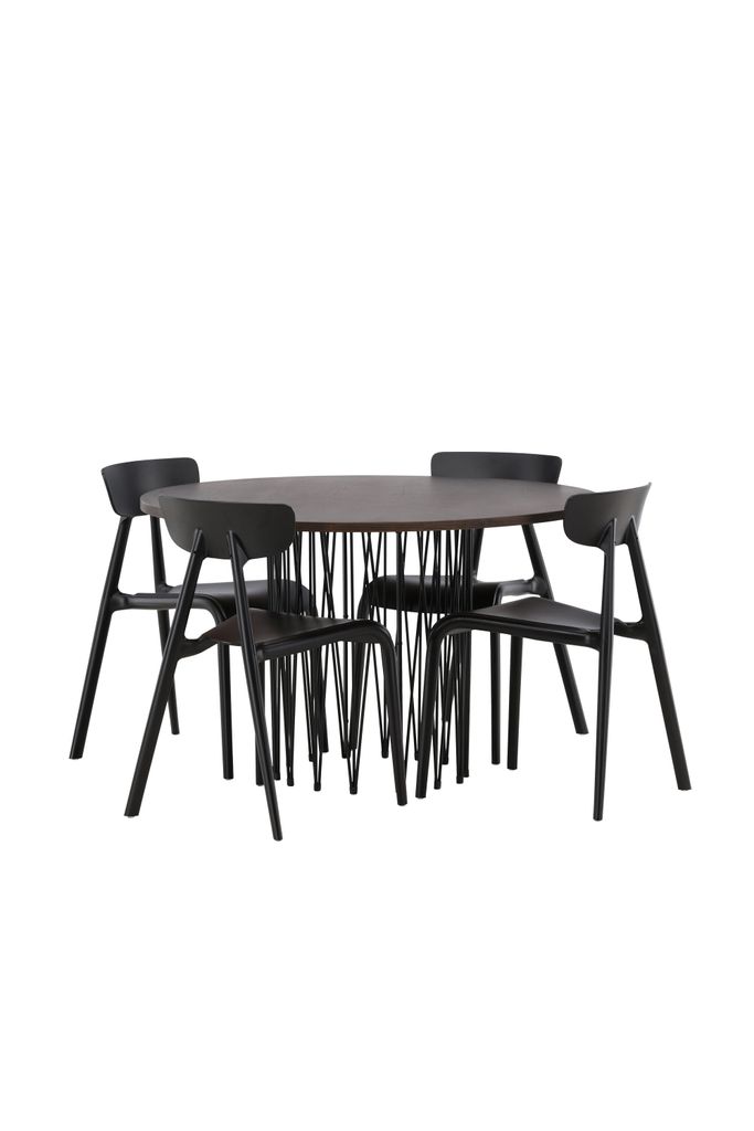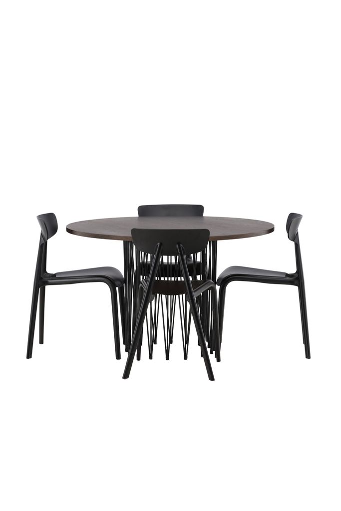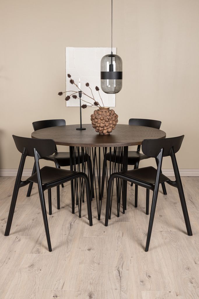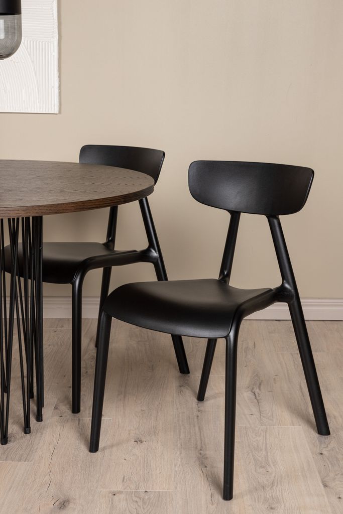 De medföljande Ursholmen-stolarna är tillverkade av tålig plast i en tidlös svart kulör. Deras utsvängda former erbjuder hög komfort och kompletterar bordets design perfekt. Med denna matgrupp kan du njuta av trevliga måltider där alla sitter bekvämt runt bordet.