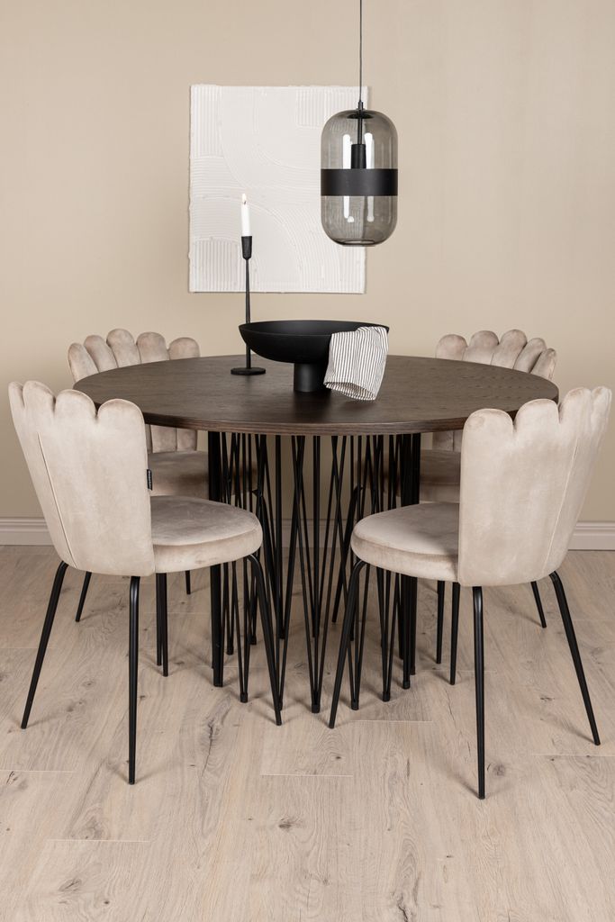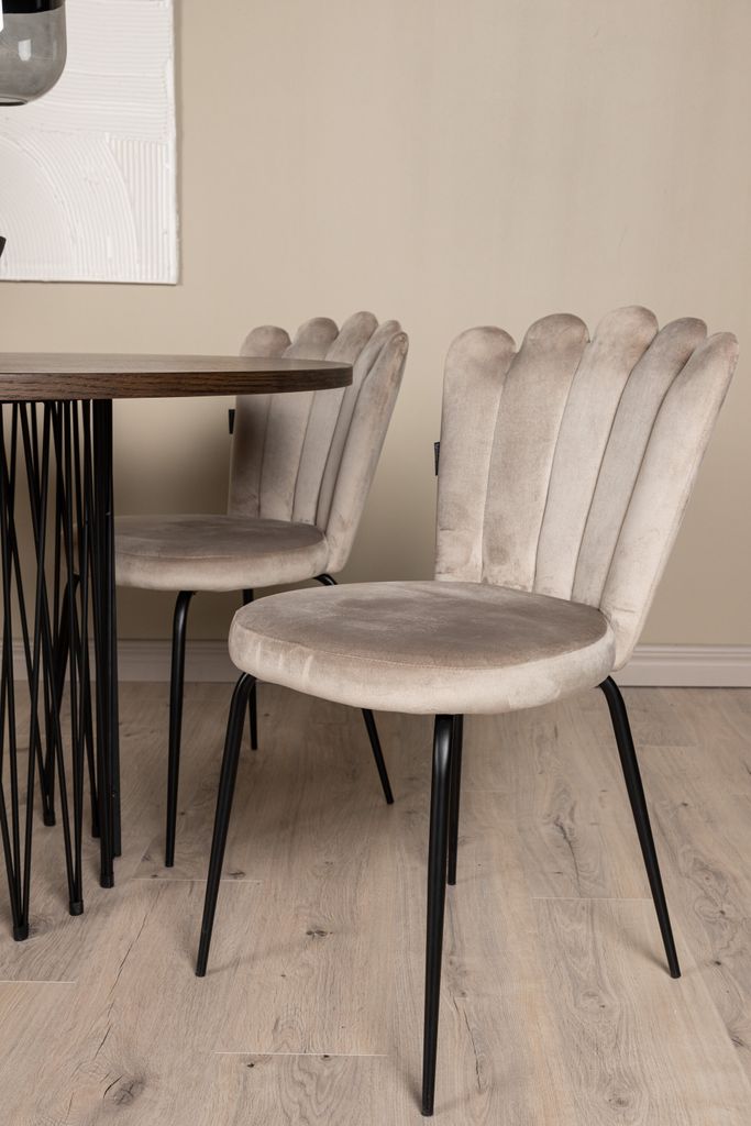 Stolarna från serien Limhamn har en inbjudande design med dekorativa snäckformade ryggar och en rund sits klädd i beige sammetstyg. Benen är tillverkade i svart pulverlackerad metall, vilket kompletterar bordets design perfekt. Dessa stolar är både stiliga och bekväma, vilket gör dem till en favorit i många hushåll.