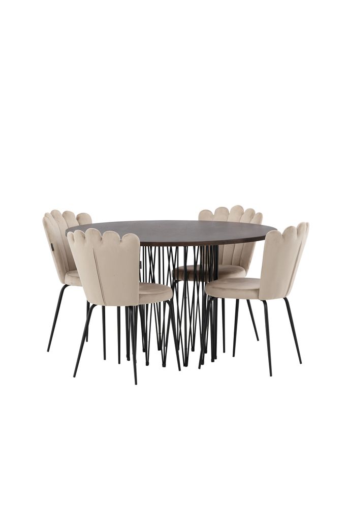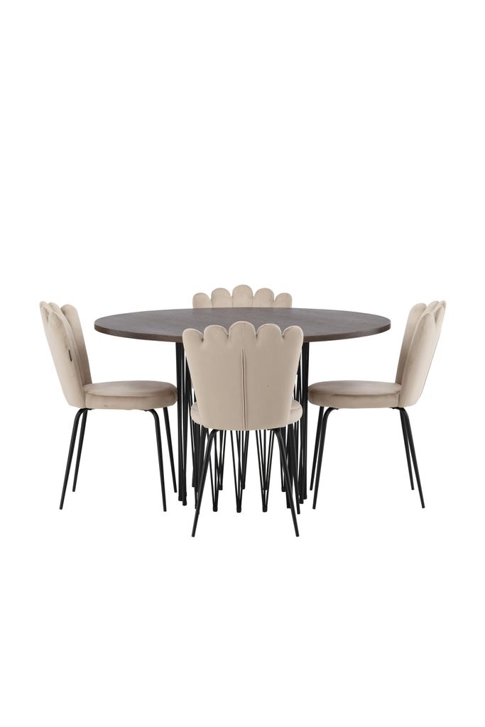 Lyxig rund matgrupp i skandinavisk design med brun MDF-bordsskiva och beige sammetstolar.