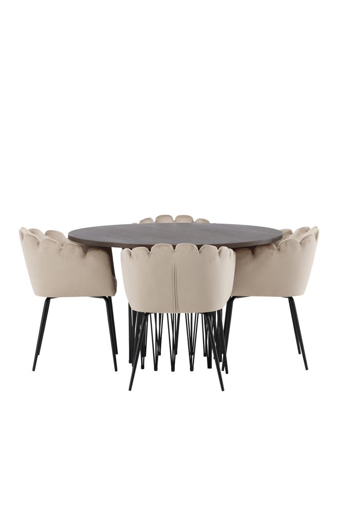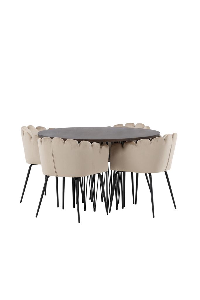 Lyxig rund matgrupp med brun MDF-bordsskiva och beige sammetsstolar. Perfekt för stilfulla hem.