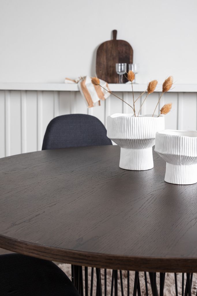 Venture Home Stone Rund Matgrupp är en perfekt kombination av stil och funktion. Det runda matbordet har en elegant brunfärgad bordsskiva tillverkad av MDF med faner, som ger en varm och inbjudande känsla. Stommen i svart metall är cylinderformad och bidrar med en modern touch till det skandinaviska designuttrycket.