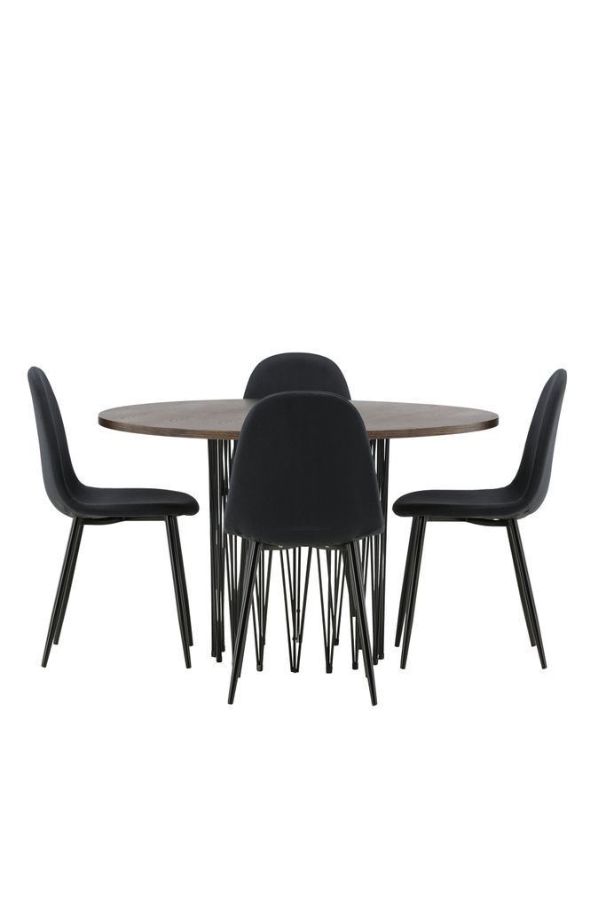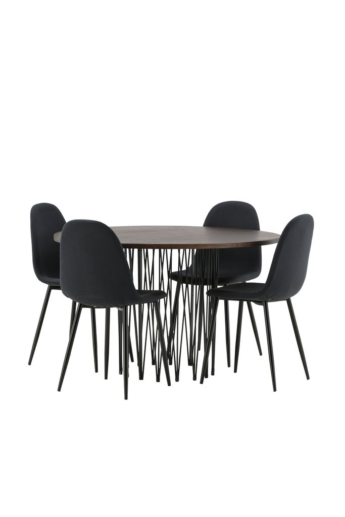 Elegant och praktisk matgrupp med brun MDF-bordsskiva och cylinderformad svart metallstomme. Inkluderar bekväma Polar-stolar med svart polyestertyg.