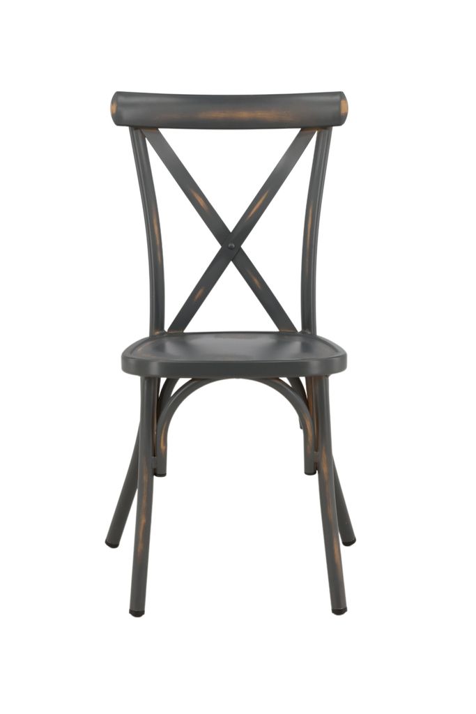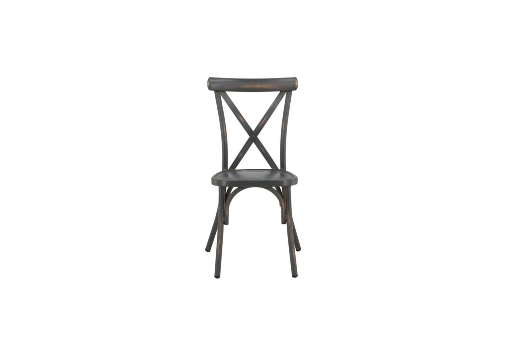 Industriell design möter hållbarhet i dessa stapelbara matstolar i mörkgrå aluminium med kryssat ryggstöd.