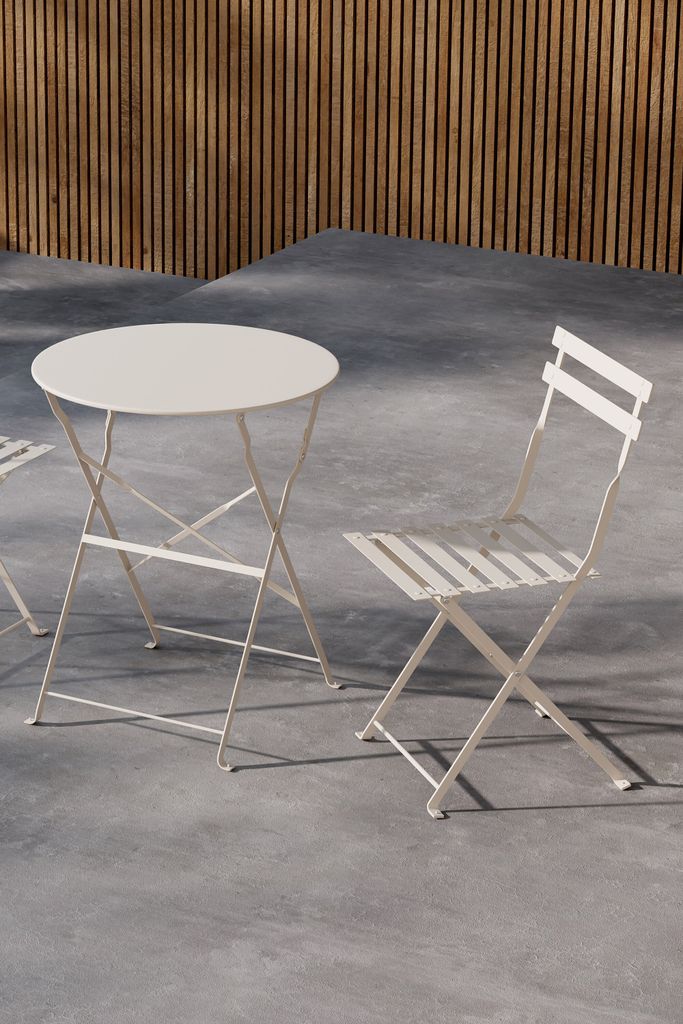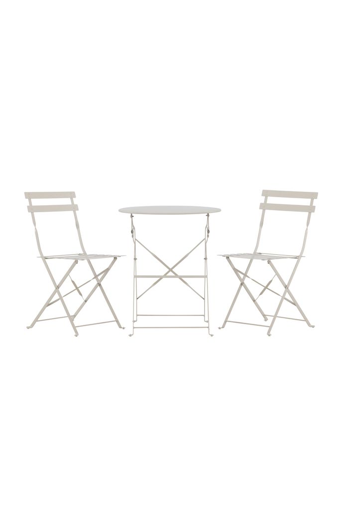 Skapa en inbjudande oas med Tao Caféset i robust stål och tidlös beige färg. Perfekt för balkongen eller uteplatsen.