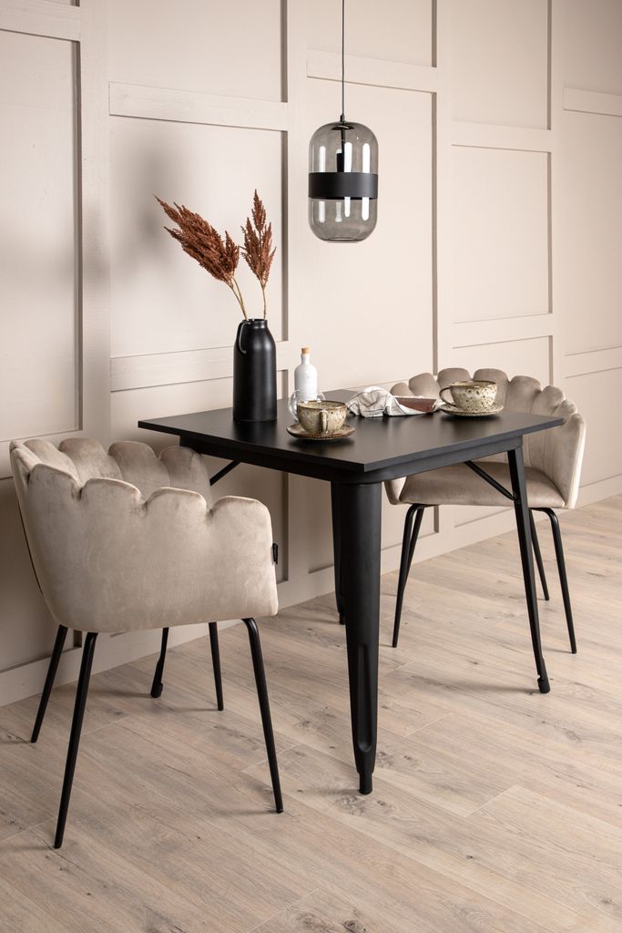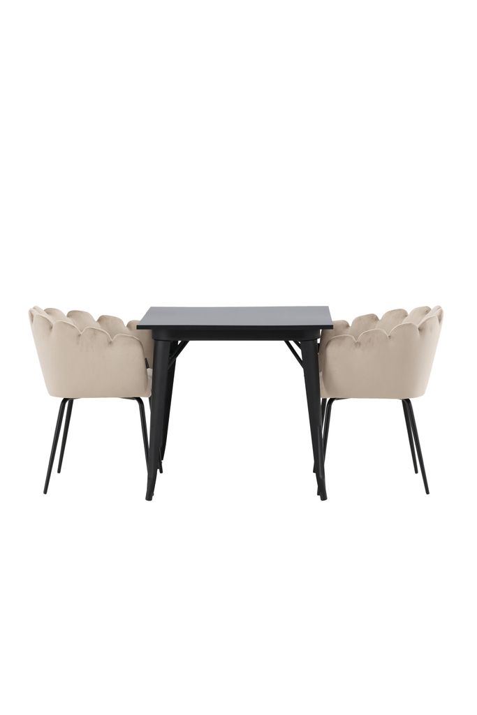 Venture Home Tempe matgrupp kombinerar elegans och komfort för din matsal. Det kvadratiska bordet har en tidlös design med en bordsskiva i svart MDF och stilrena ben i svart metall, vilket ger en sofistikerad känsla. Matgruppen kompletteras av två stolar från serien Limhamn, kända för sin moderna och inbjudande design.