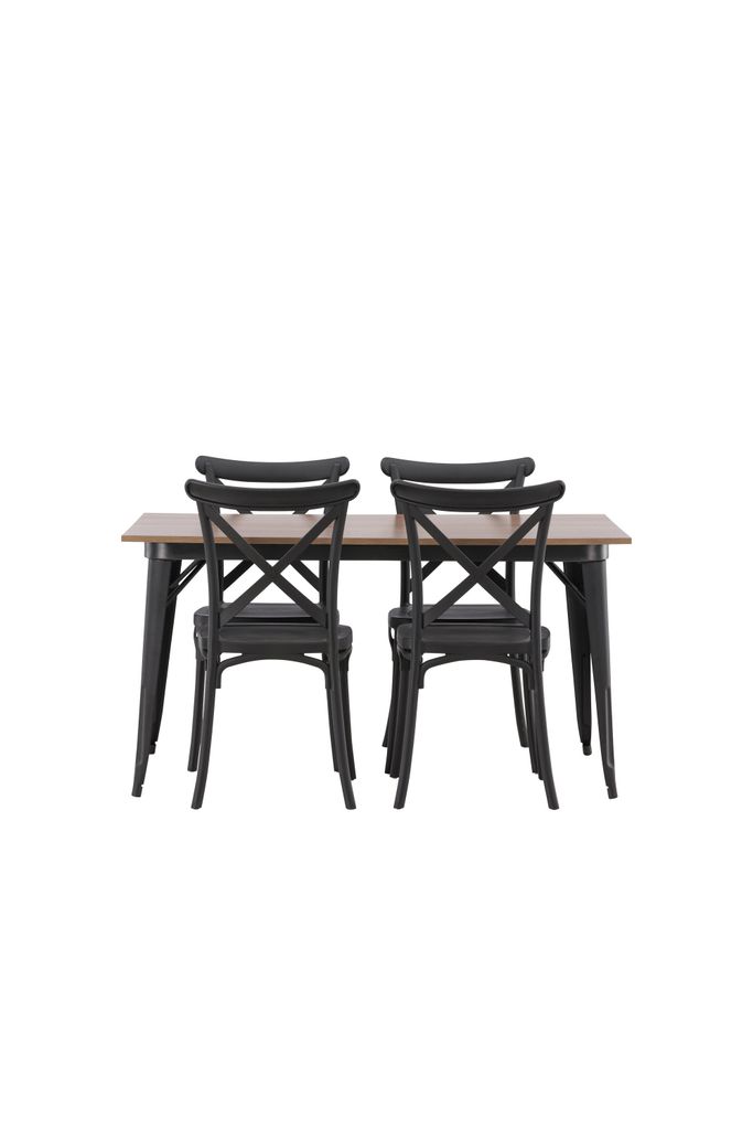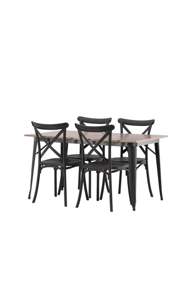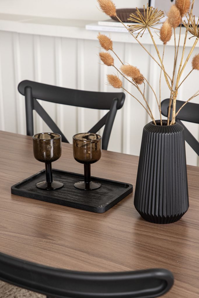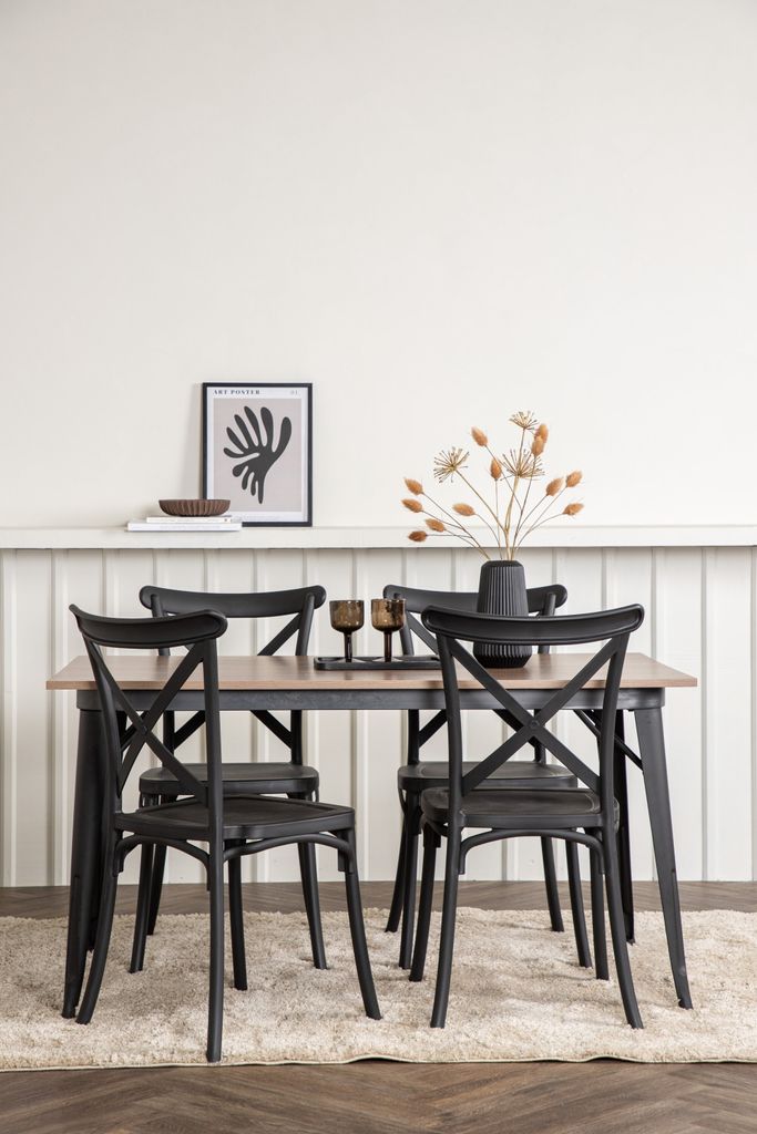 De medföljande matstolarna från serien Crosett har en nostalgisk design med en kryssad rygg och raka linjer, vilket ger en känsla av tidlös elegans. Stolarna är tillverkade i hållbar svart plast, vilket gör dem lätta att underhålla och perfekta för daglig användning.