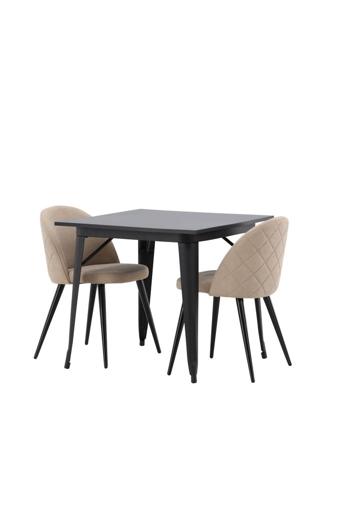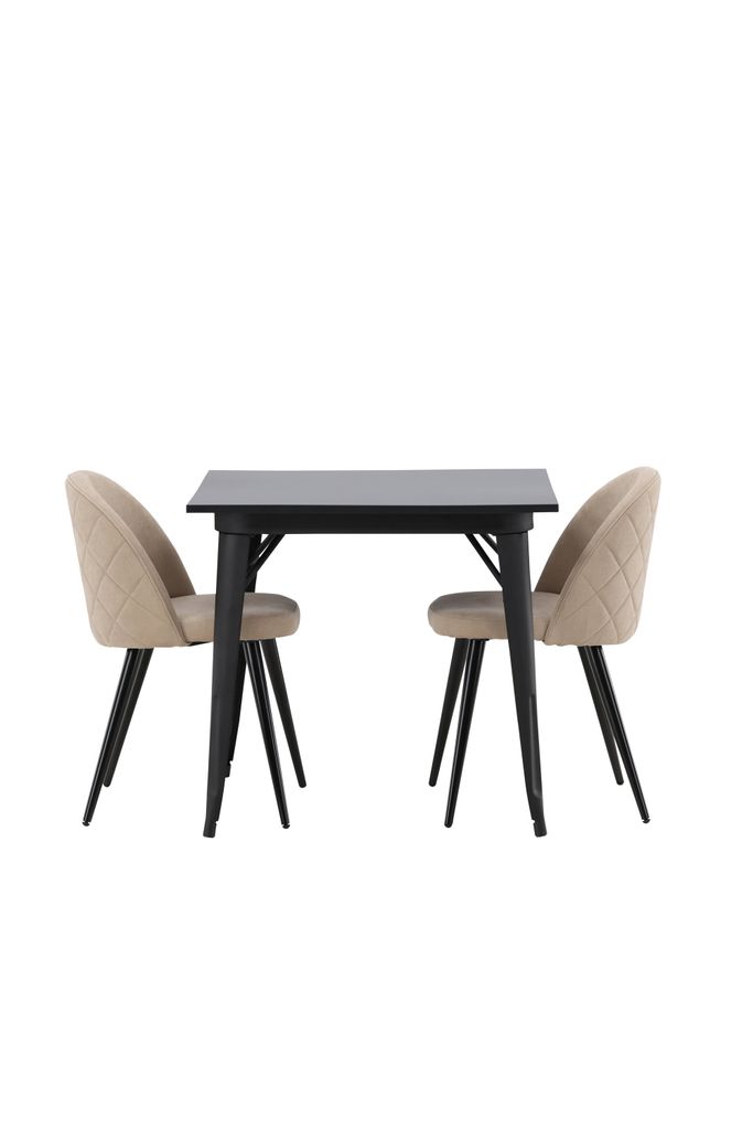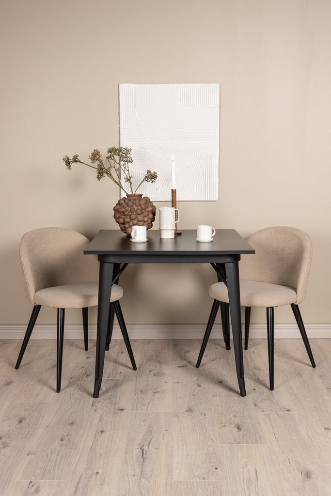 Upptäck Venture Home Tempe Rektangulär Matgrupp, den perfekta lösningen för det lilla köket. Denna charmiga matgrupp kombinerar ett elegant svart bord med två stilfulla stolar i varm beige. Bordet, med sin rektangulära form, har en robust bordsskiva i svart MDF och stabila ben i svart metall. De två stolarna från serien Velvet Stitches erbjuder komfort med sin helklädda design, lätt rundade ryggar och mjuka sitsar i polyestertyg. Stålbenen i svart pulverlackerad metall ger en modern touch och stabilitet.