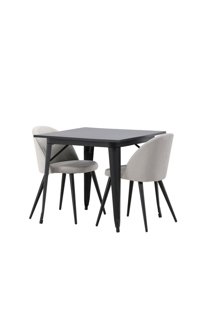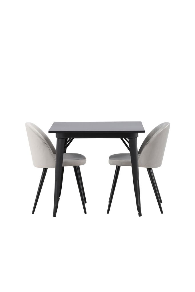 De två medföljande Velvet-stolarna har en mjukt rundad rygg och sits klädd i behagligt grått sammetstyg, vilket ger en känsla av lyx och komfort. Stolsbenen i svart pulverlackerad metall kompletterar bordets design och skapar en harmonisk helhet.