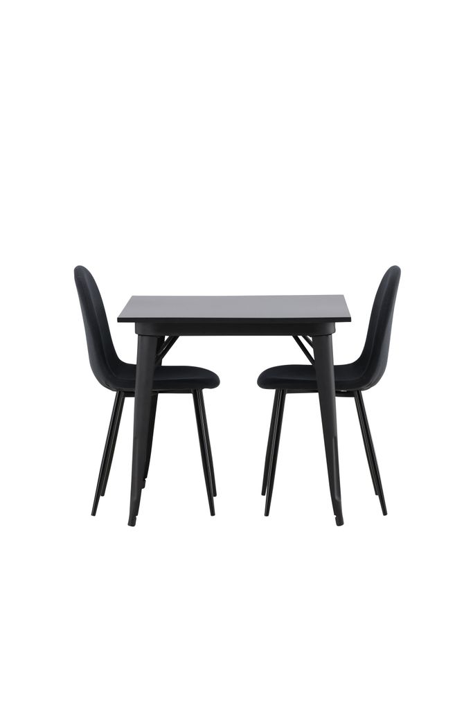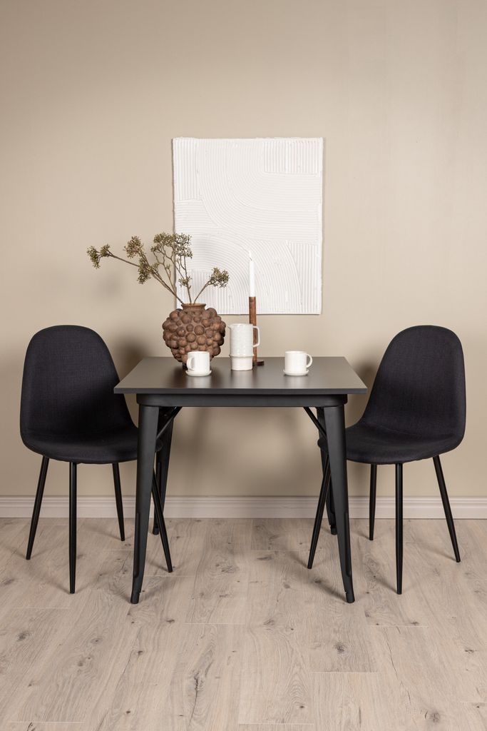 Elegant matgrupp för två med svart MDF-bord och stilrena stolar i svart polyestertyg, perfekt för små utrymmen.