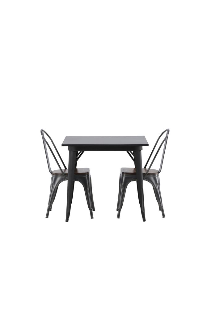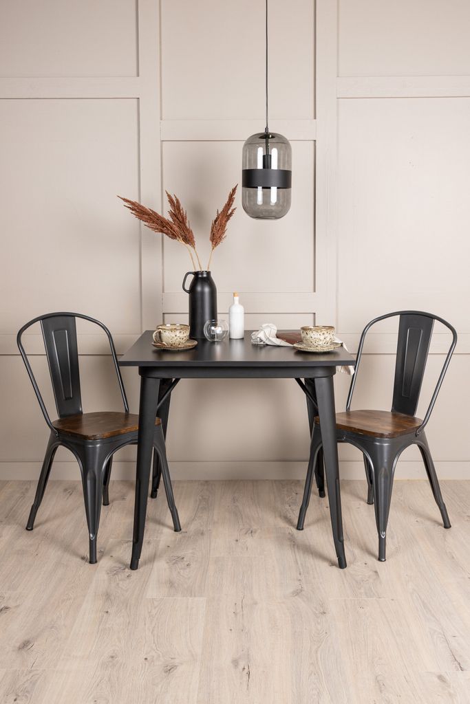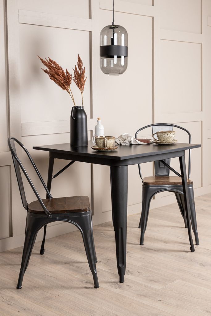De medföljande stolarna är en del av Venture Home kollektionen och erbjuder en klassisk rustik design. Stolarna har lätt utsvängda ben i mörkgrått stål, vilket ger stabilitet och stil. Sitsen i mörkt trä kompletterar den sofistikerade looken och bjuder in till komfort och elegans.