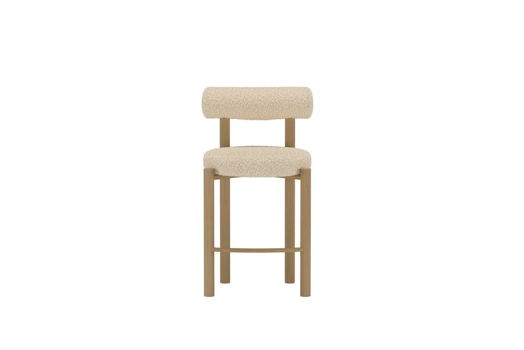 Tillo är en stilren barstol som kombinerar rundade former med en mjuk sits i vit bouclé. Den enkla men genomtänkta designen ger ett modernt uttryck som passar perfekt vid köksön eller barbordet.