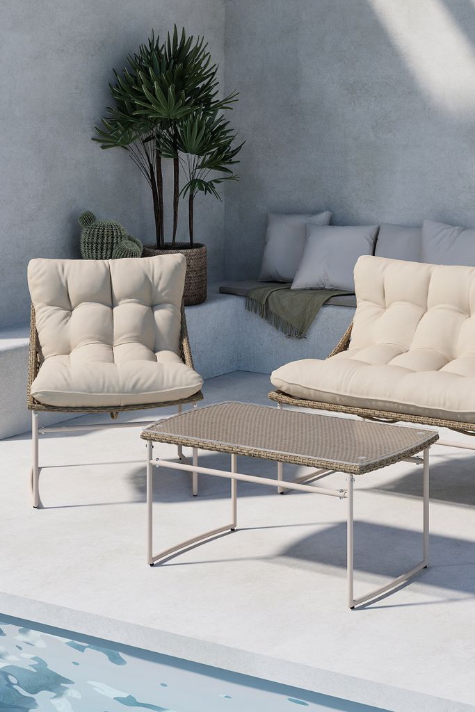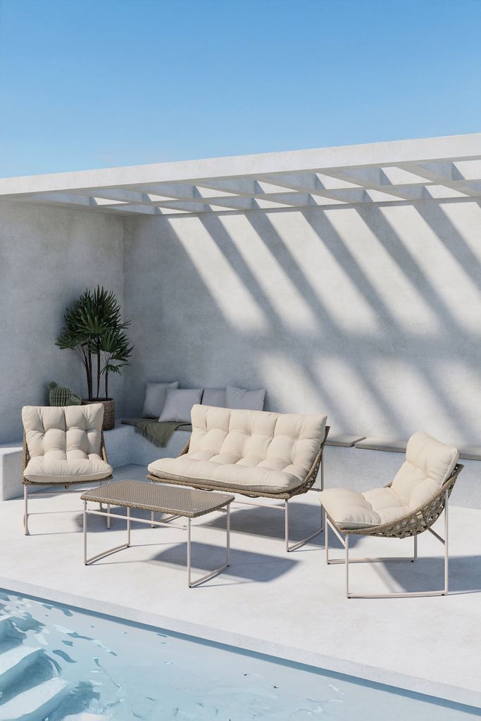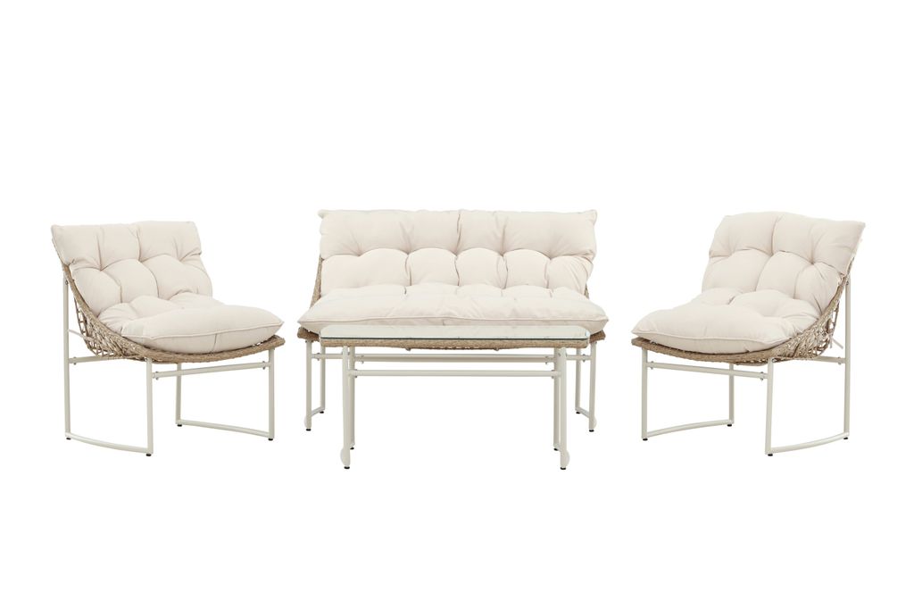 Soffgruppen har en stabil stålram och sitsar i konstrotting, vilket inte bara ger en robust konstruktion utan också ett modernt utseende. De medföljande beige dynorna är både snygga och bekväma, vilket gör det enkelt att varva ner under långa sommarkvällar.