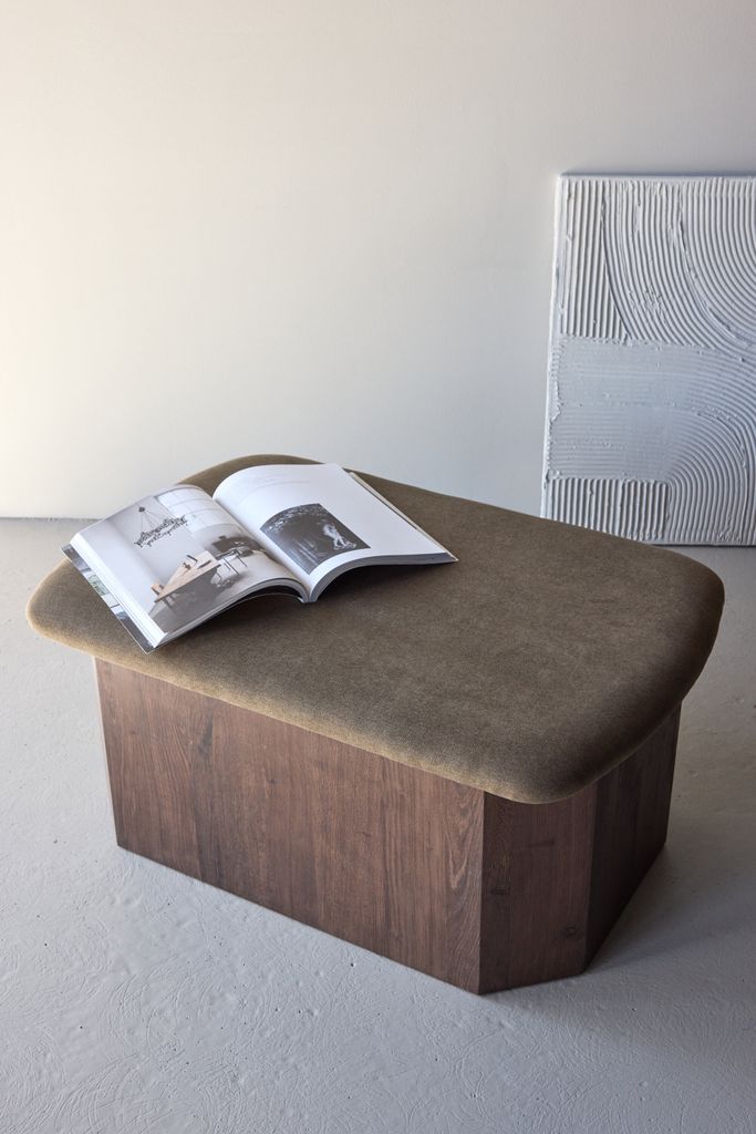 Elegant ottoman i trendig mocca med mångsidig funktionalitet och modern design.