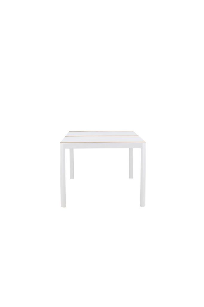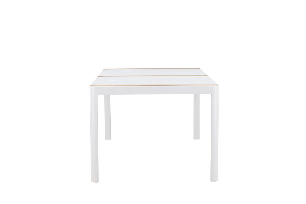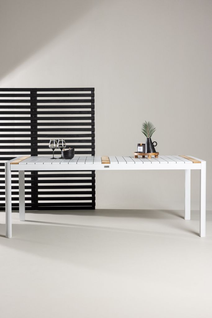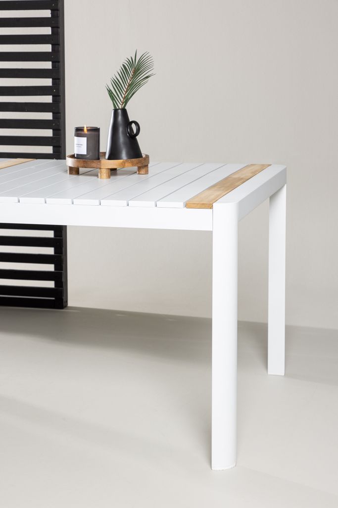 De naturliga oljorna i teaken gör att bordet kräver minimalt underhåll och är idealiskt för utomhusbruk. Den vita aluminiumfinishen ger en modern touch och förstärker bordets tidlösa design. De subtila detaljerna, som synliga teakinslag i bordsskivan, skapar en harmonisk mix av material.