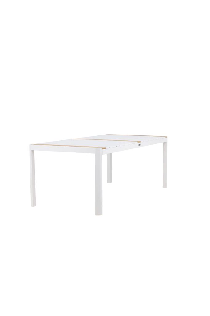 Venture Home Togo är ett elegant matbord designat för att förhöja din uteplatsupplevelse. Med en bordsskiva i teak och ett underrede i vitmålad aluminium, kombinerar det både stil och hållbarhet. Bordet mäter 200x100 cm vilket ger gott om plats för härliga middagar under sommarhimlen.
