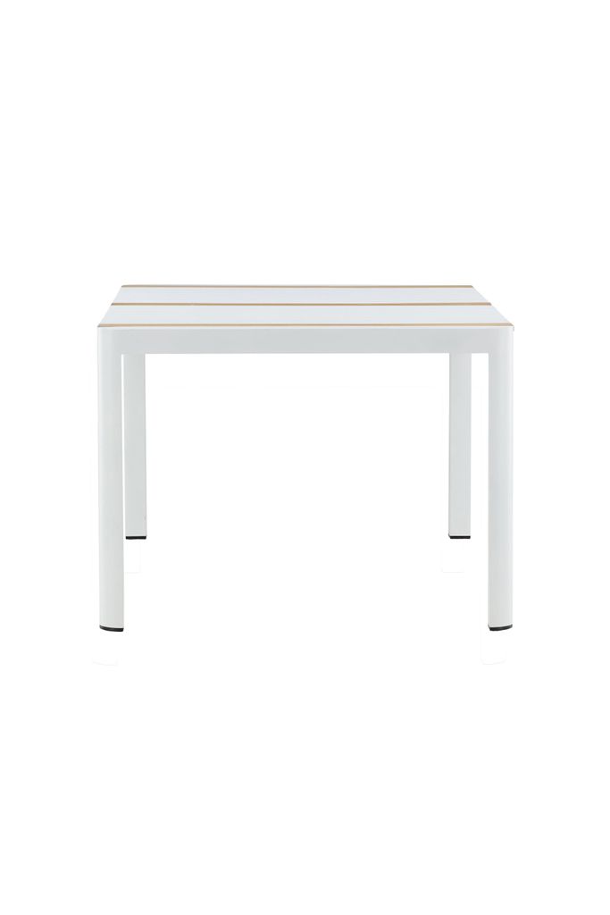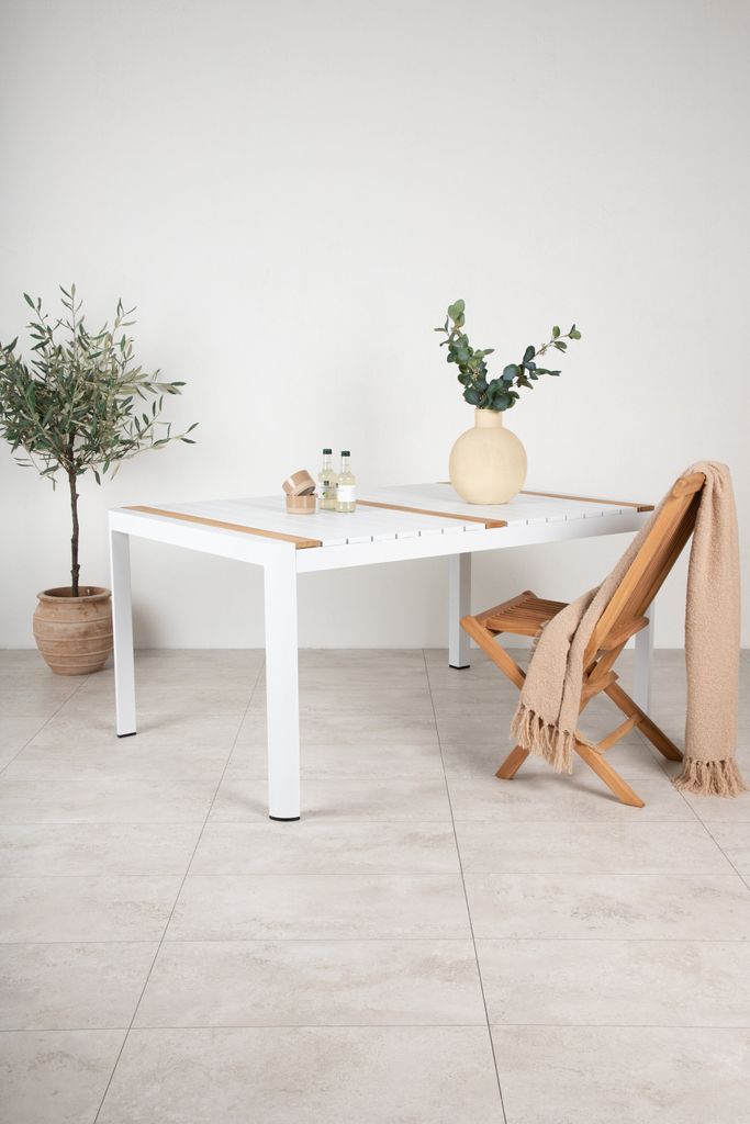 Elegant matbord med teakskiva och vit aluminiumstomme. Perfekt för både uteplats och terrass med skandinavisk design.