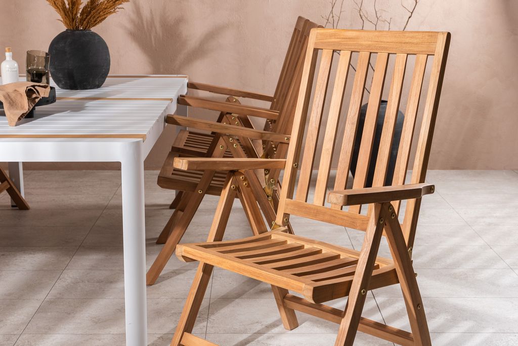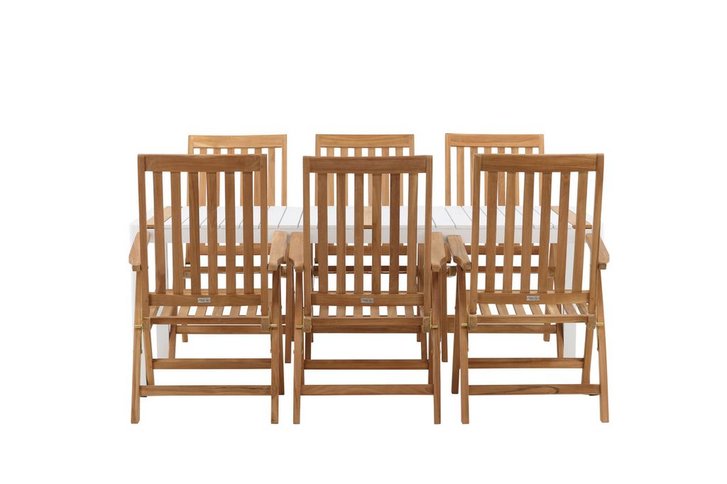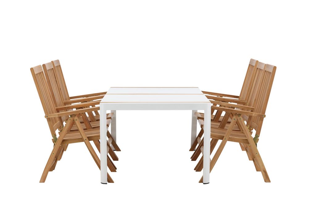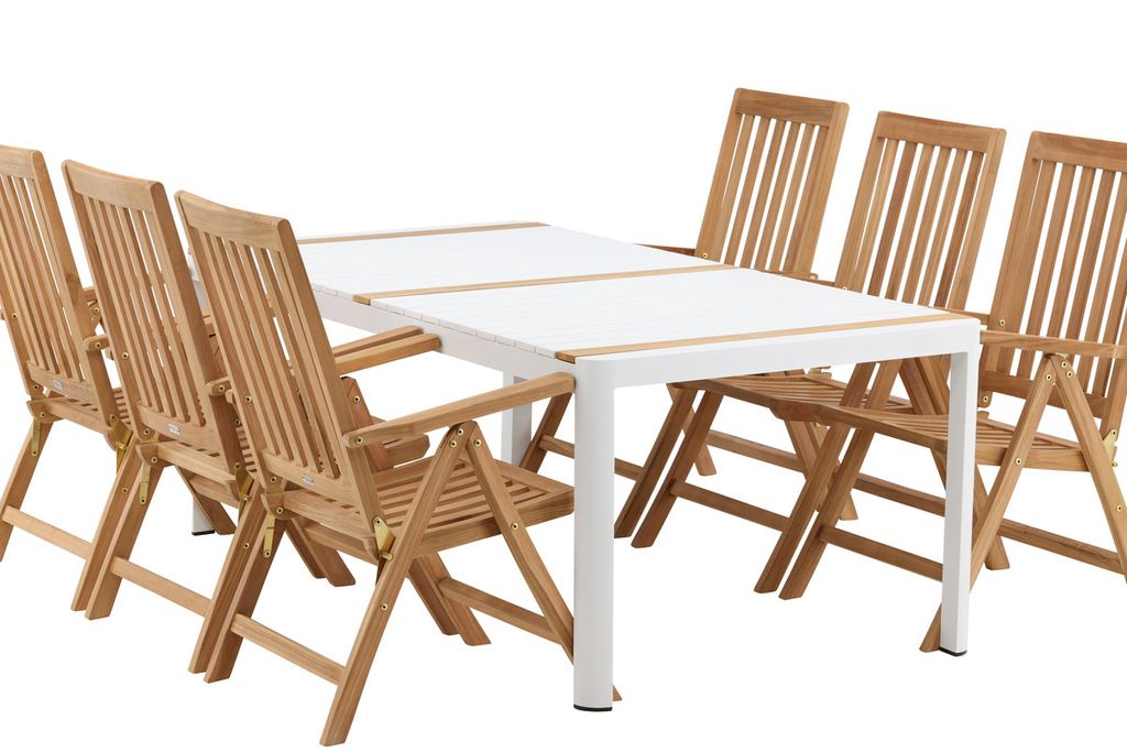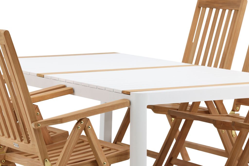 Skapa en blickfång som imponerar - den här matgruppen är lika iögonfallande som slitstark! Matbord Togo har ett smakfullt utförande med en rektangulär bordsskiva i vit och träfärgad teak och ett underrede i vit aluminium. Mått: 200x100 cm. De läckra teak-detaljerna i bordsskivan gör att bordet matchar utmärkt med matstolarna från serien Kenya. Stolarna är både fällbara och hopfällbara samt har armstöd för extra komfort. Tillverkade i smakfull teak i en ribbad design som ger ett väldigt modernt intryck. Låt tiden här bli dagens höjdpunkt!