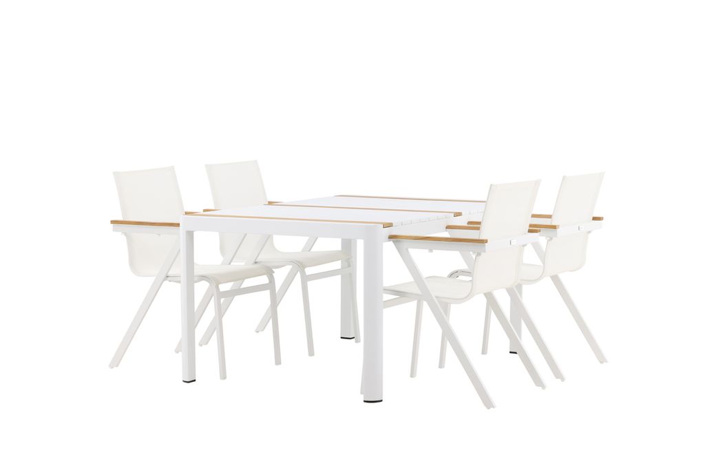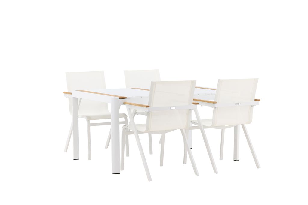 Elegant matgrupp med bord i vit och teak, samt stapelbara stolar i vit aluminium och teakdetaljer.