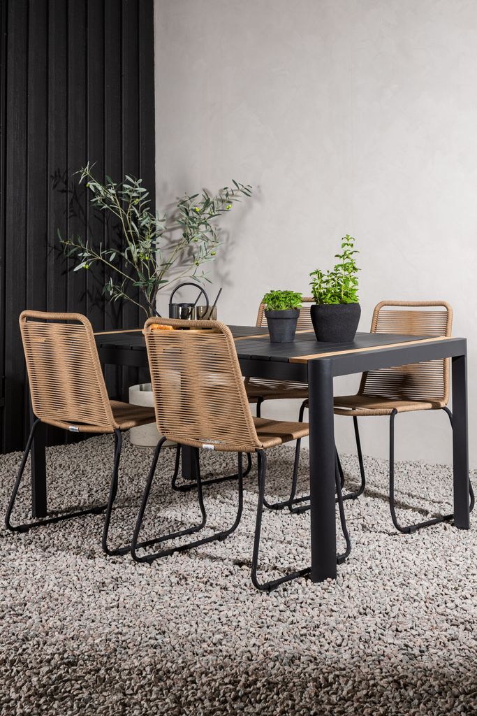 Bordet mäter 150x100 cm, vilket gör det idealiskt för både familjemiddagar och sociala tillställningar. De medföljande lattefärgade stolarna från serien Lindos har en sits i slitstarkt beige rep och smala, stilrena ben i svart stål. Den jordnära nyansen på stolarna skapar en varm och inbjudande atmosfär.