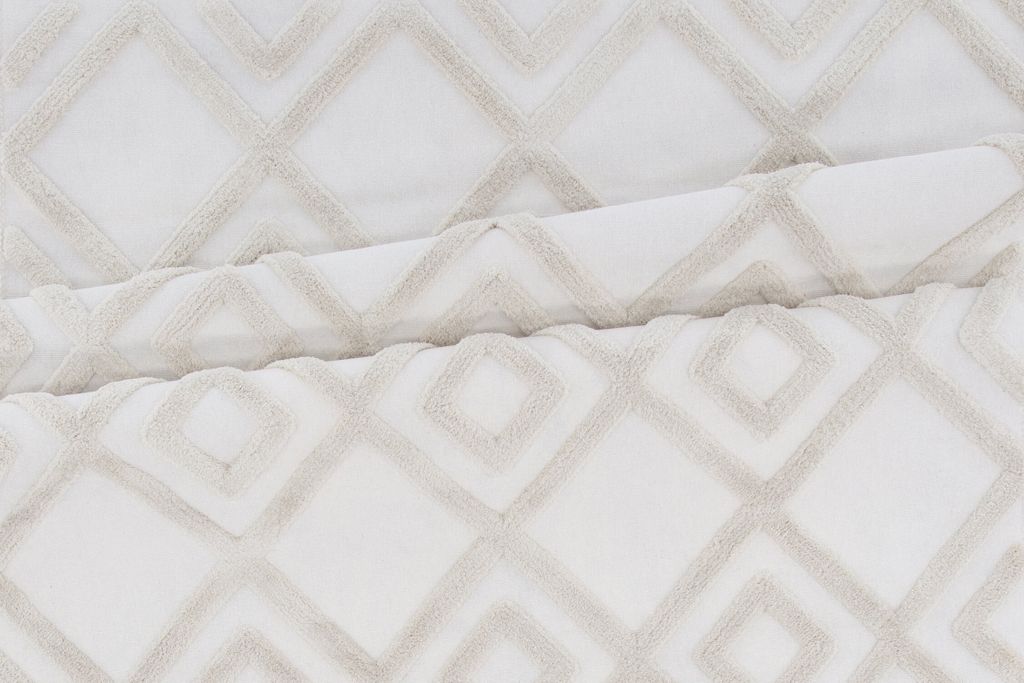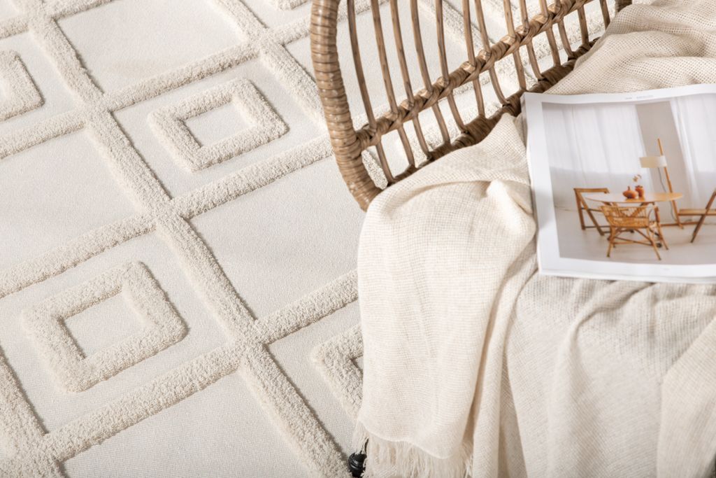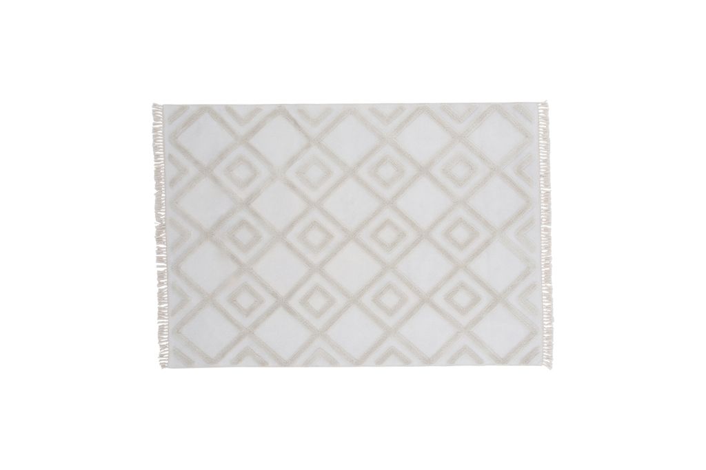 Modern och stilren matta i vitt med strukturerat mönster och dekorativa fransar. Perfekt för att ge rummet djup och karaktär.