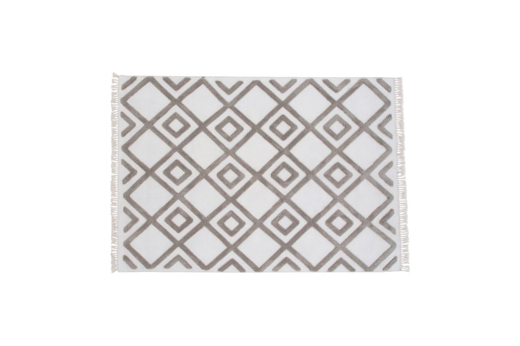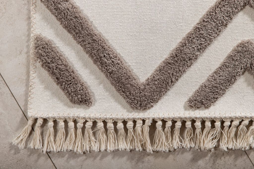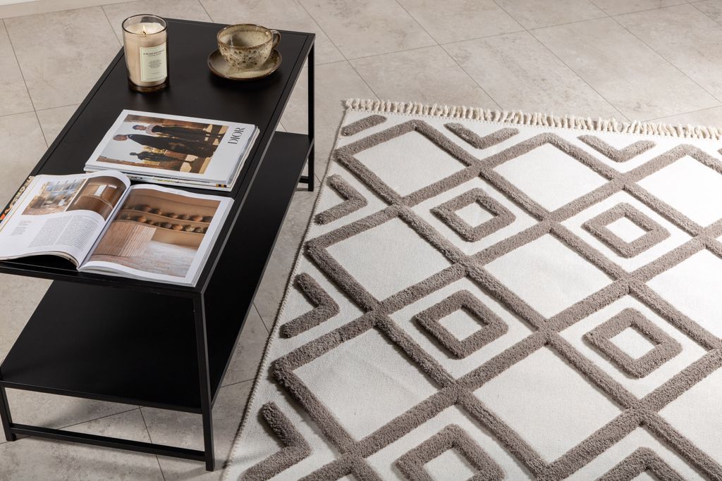 Modern vit matta med strukturerat brunt mönster och fransar. Perfekt för att lyfta vardagsrummet.
