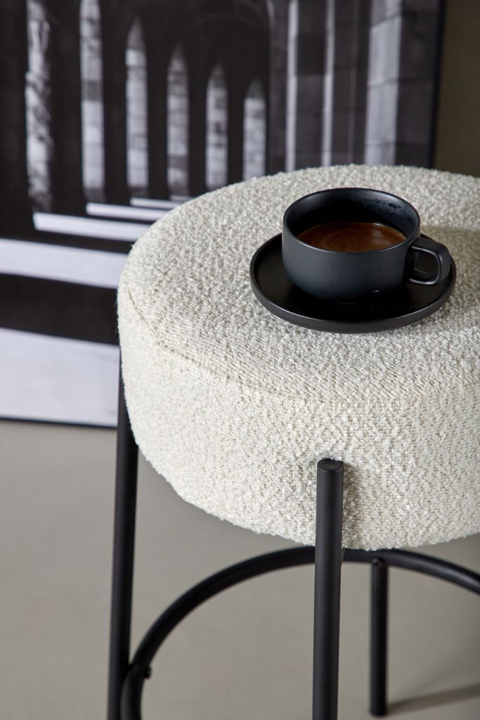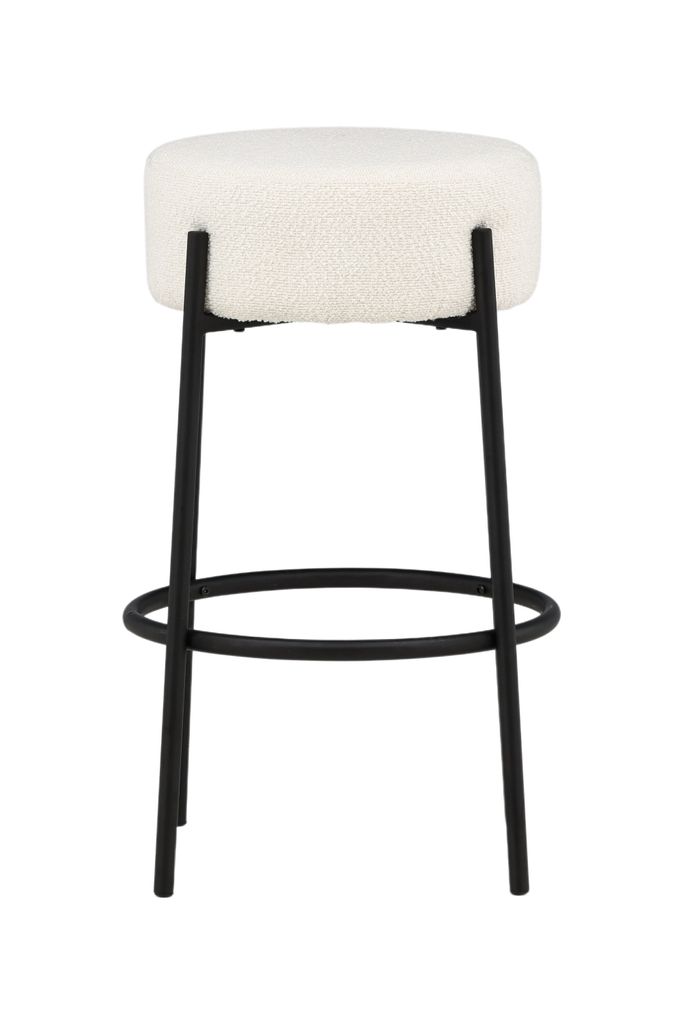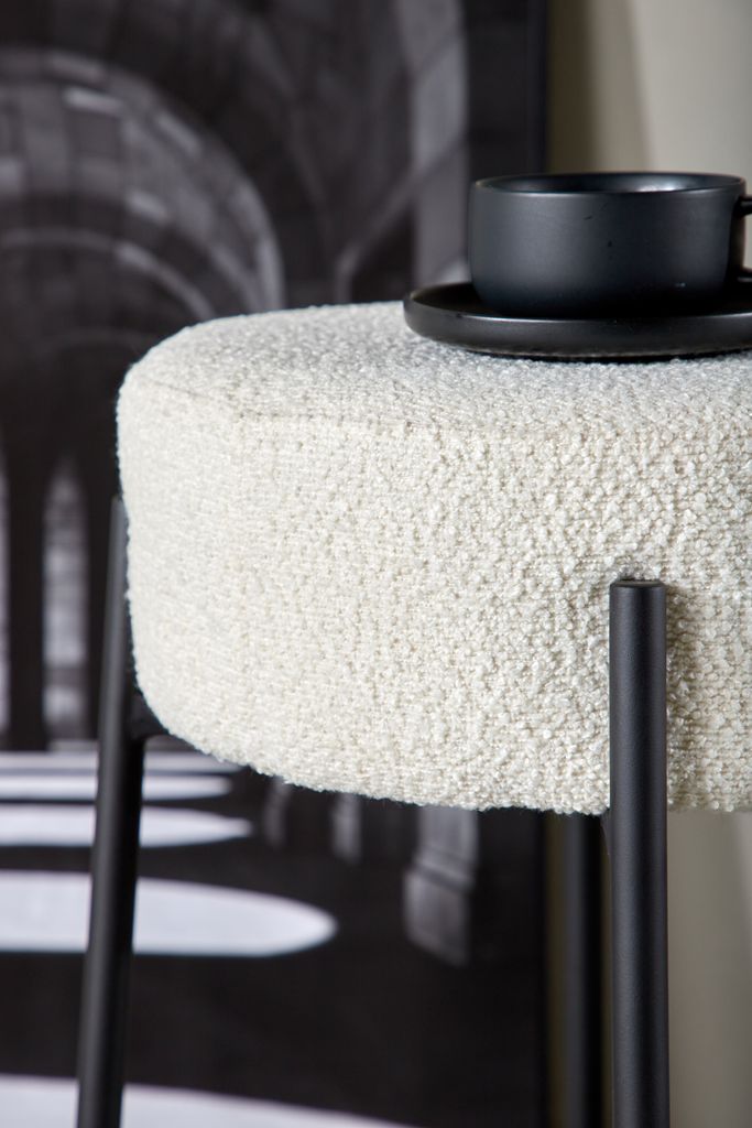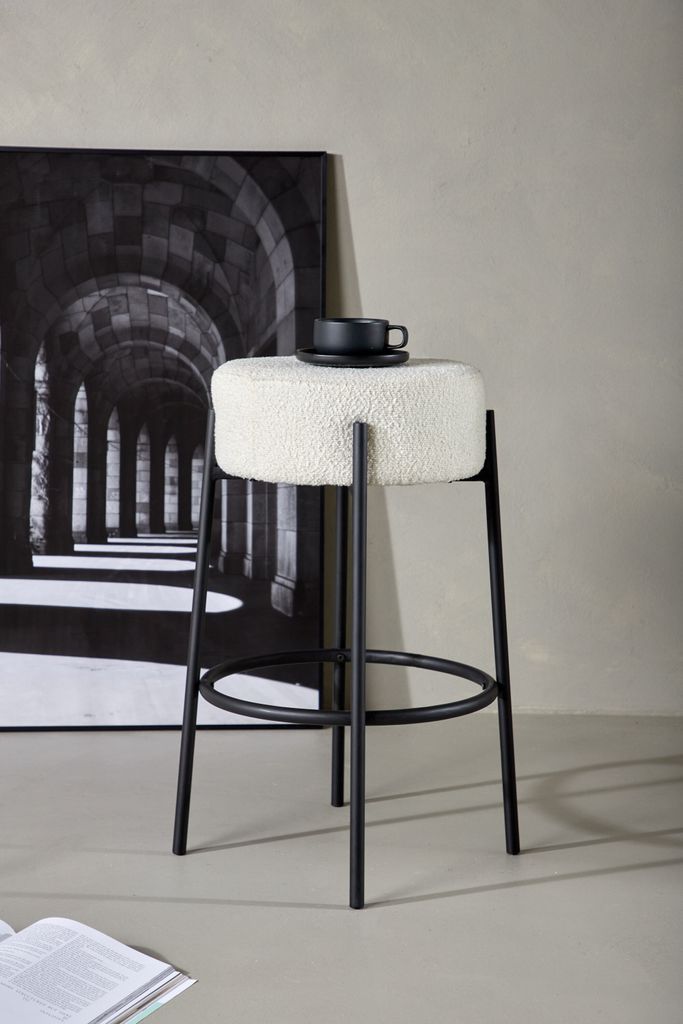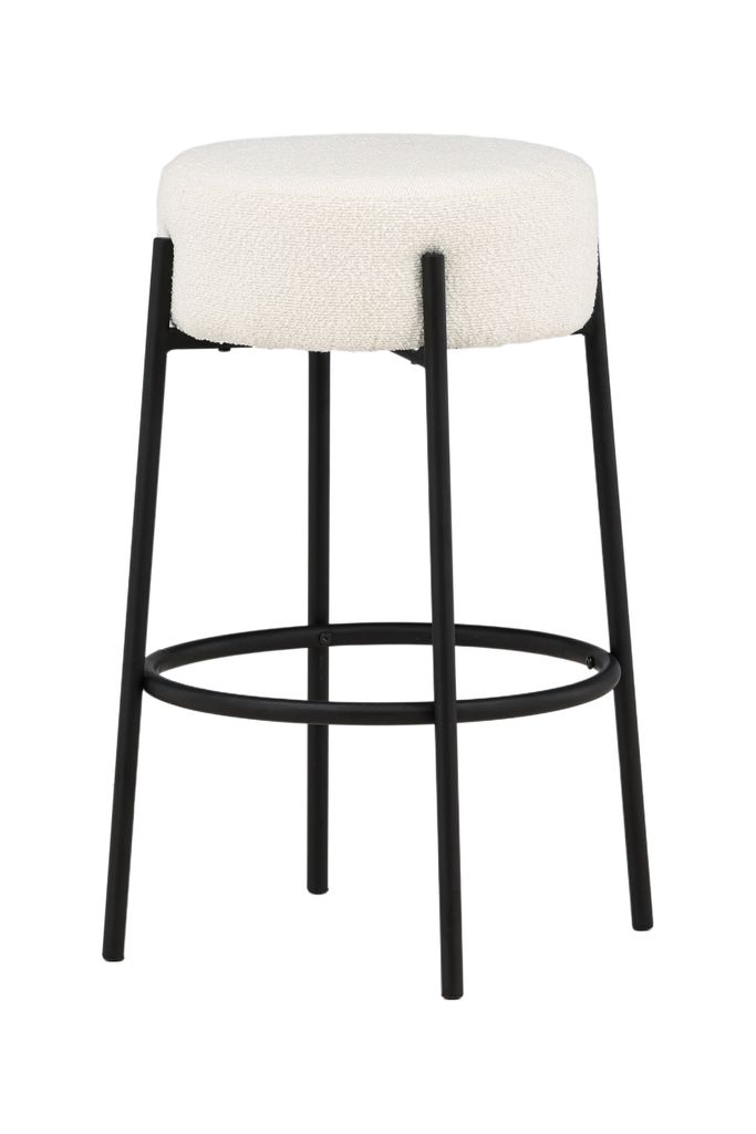 Elegant barstol i vitt boucletyg och svart stål, perfekt för moderna hem och kök.