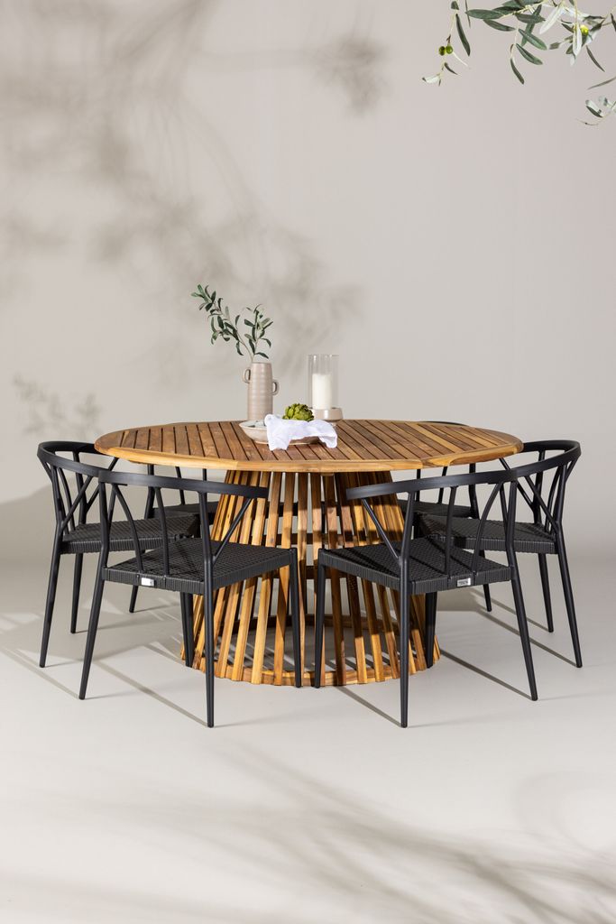 Denna matgrupp levereras med sex bekväma stolar, perfekta för avkopplande måltider under bar himmel. Med Venture Home Tucumán och Stina kan du skapa en stilfull och funktionell matplats för alla dina utomhusaktiviteter.