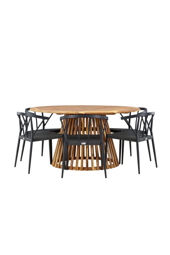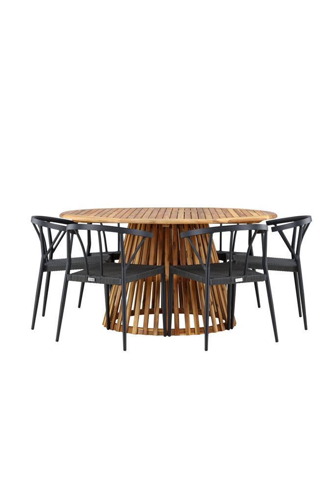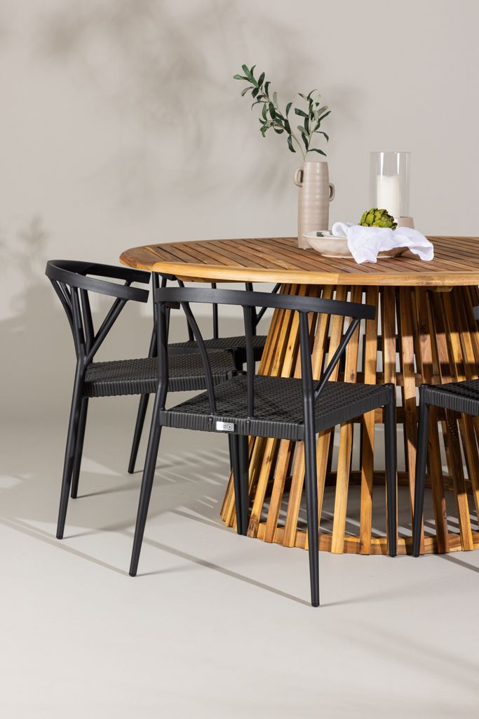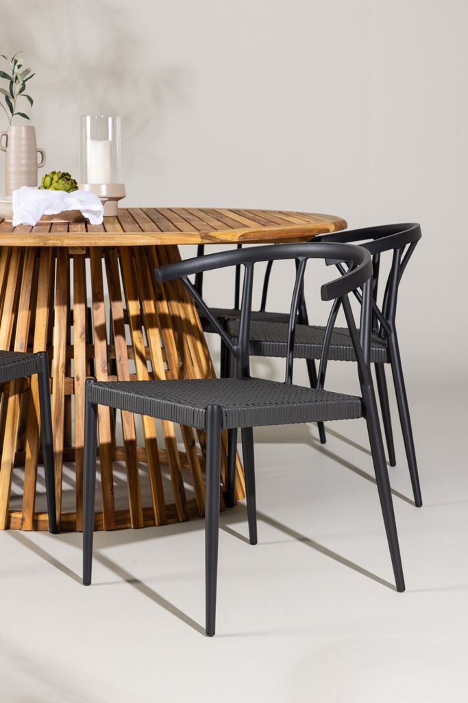 Stina-stolarna i elegant svart wicker-material kompletterar bordets naturliga träfärg och ger din utomhusmatplats en sofistikerad touch. Konstruktionen är både robust och väderbeständig, vilket gör dem idealiska för utomhusbruk.