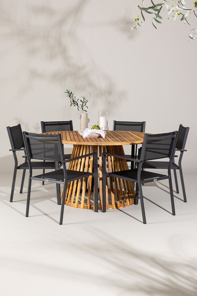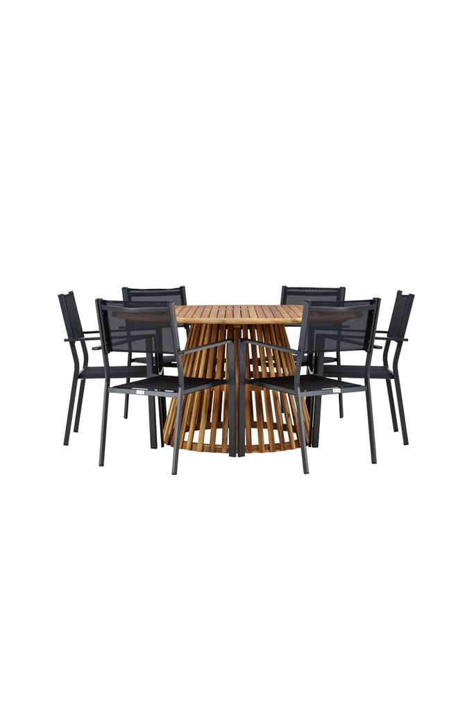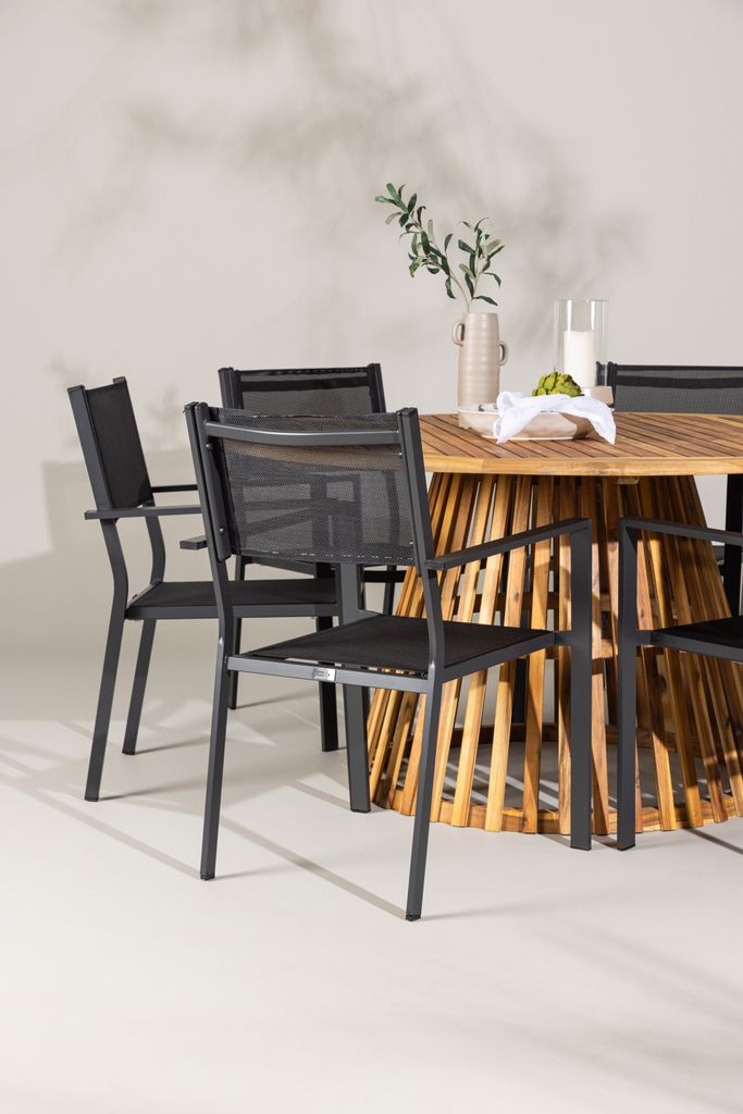 Stolarna Copacabana är tillverkade av robust aluminium i en elegant svart färg, vilket ger en sofistikerad touch till din utomhusmatplats. Den stilfulla designen kompletterar bordets naturliga träfärg på ett smakfullt sätt. Setet levereras komplett med sex bekväma stolar, vilket gör det perfekt för sociala samkväm och familjemiddagar utomhus.