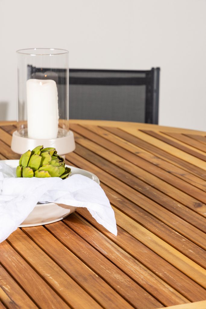 Upptäck den perfekta matgruppen för din utomhusmiljö med Venture Home Tucumán Rund Matgrupp. Denna eleganta matgrupp består av ett imponerande bord med en diameter på 120 cm, tillverkat av vackert akaciaträ som ger en naturlig och inbjudande känsla. Bordets naturfärg smälter harmoniskt in i omgivningen, vilket skapar en fridfull atmosfär för avkopplande middagar under öppen himmel.