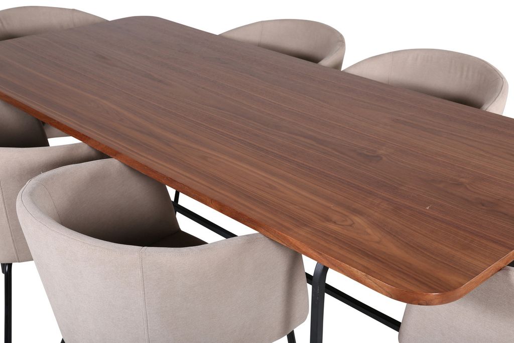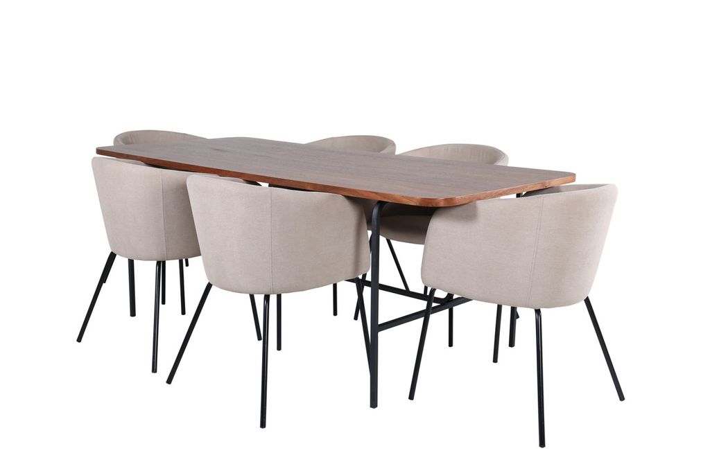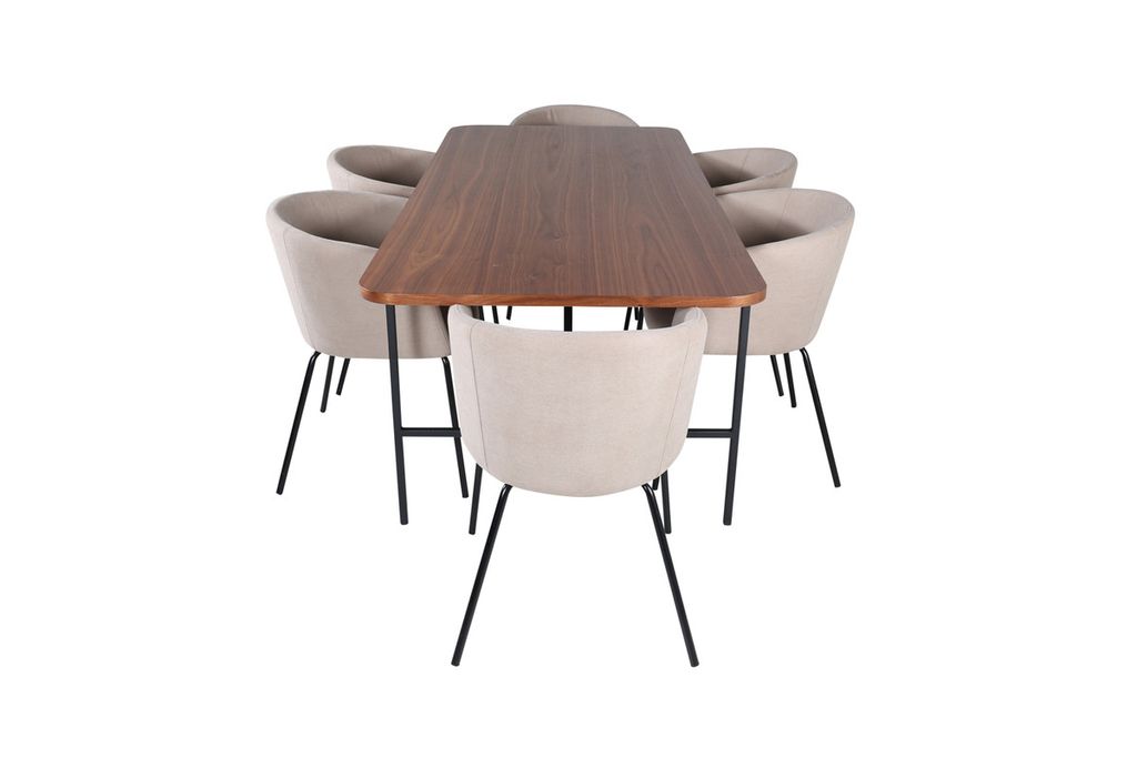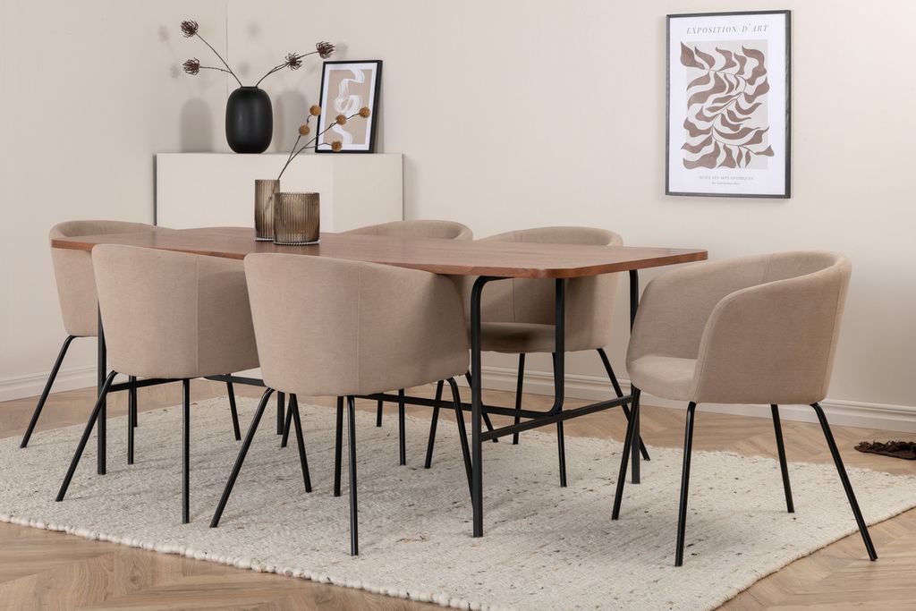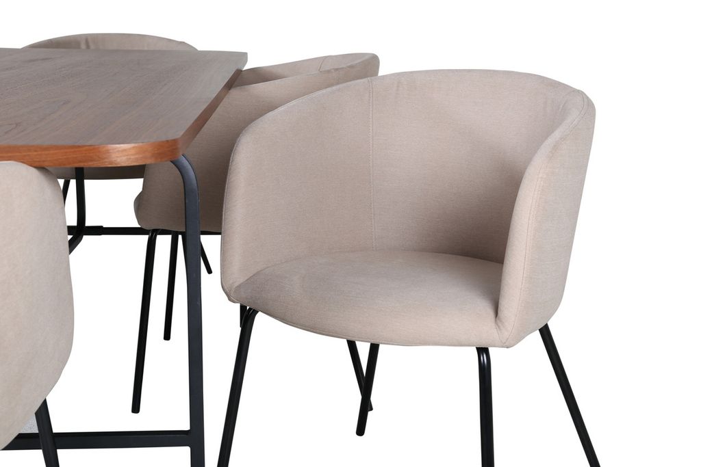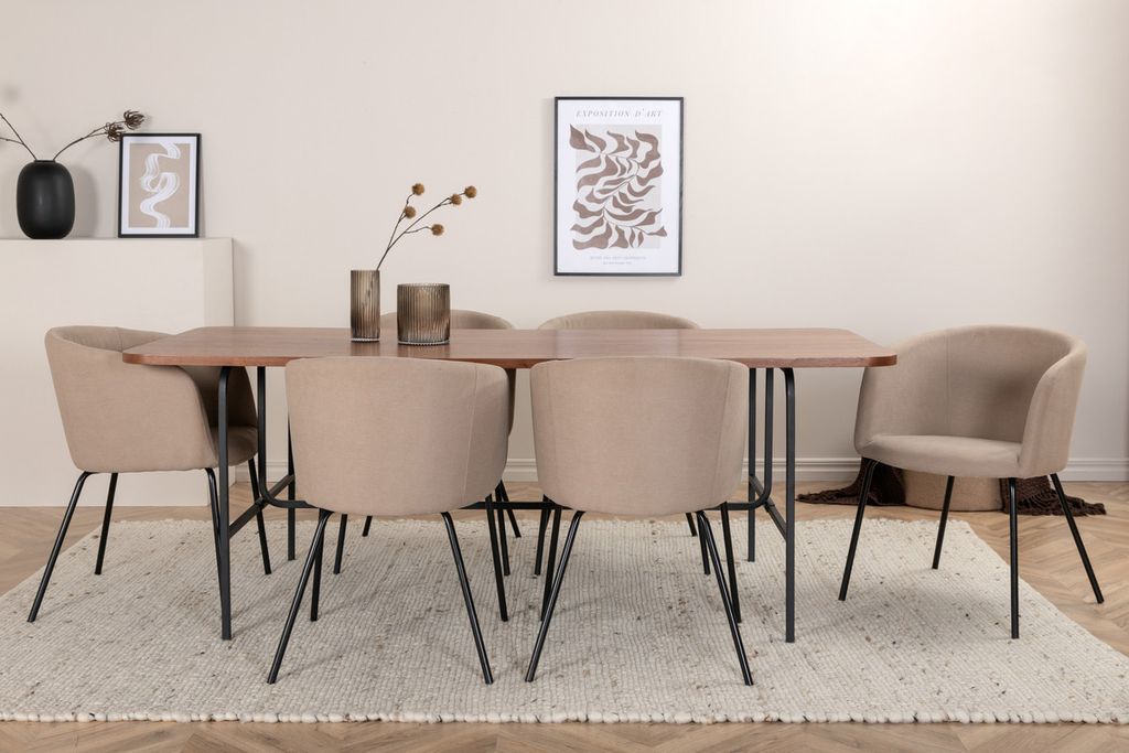 Vårt omtyckta matbord Uno är lika stilsäkert som tidlöst! är rektangulärt utformat med lätt rundade hörn, en toppskiva i valnötsfärgad MDF med faner samt stilrent underrede i svart metall. Bordets mått: Längd: 200cm, Bredd: 90cm, Höjd: 74cm. Här i perfekt kombination med 6st Berit matstolar i beige polyester linne och stilrent smala stolsben i svart järn. Stolens mått: Höjd: 78cm, Sitthöjd: 49cm, Bredd: 55cm, Djup: 55cm. En matgrupp med fokus på komfort och elegans!
