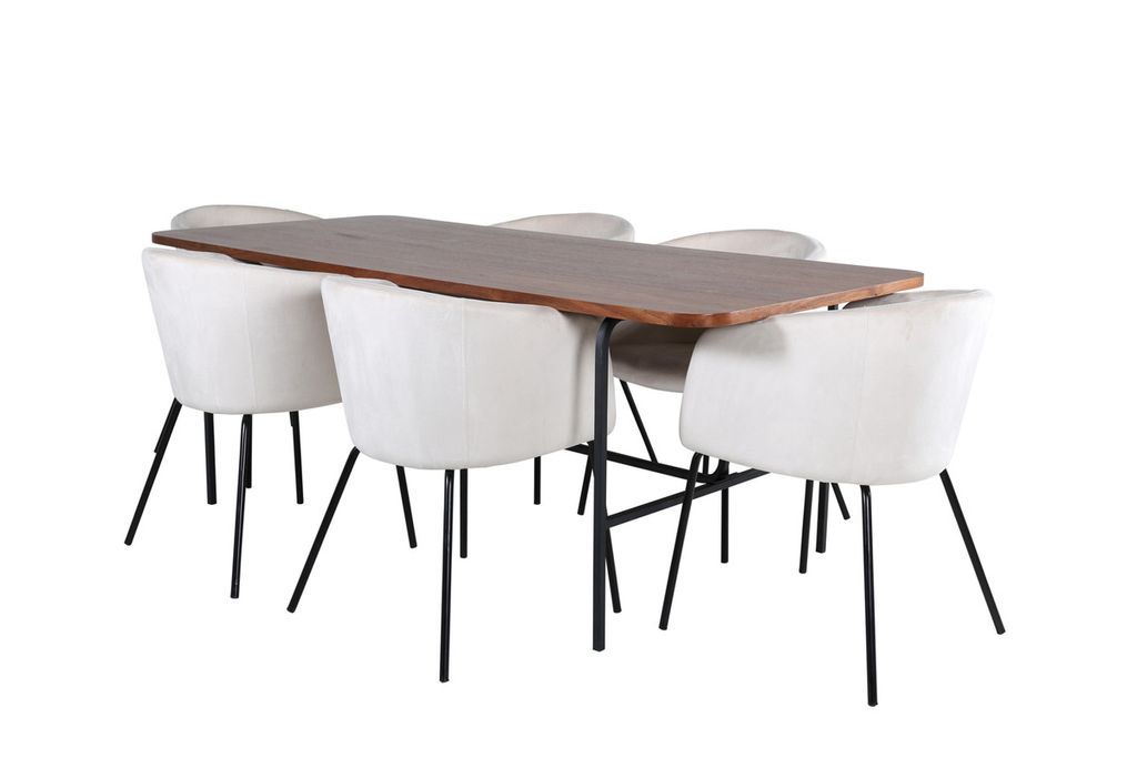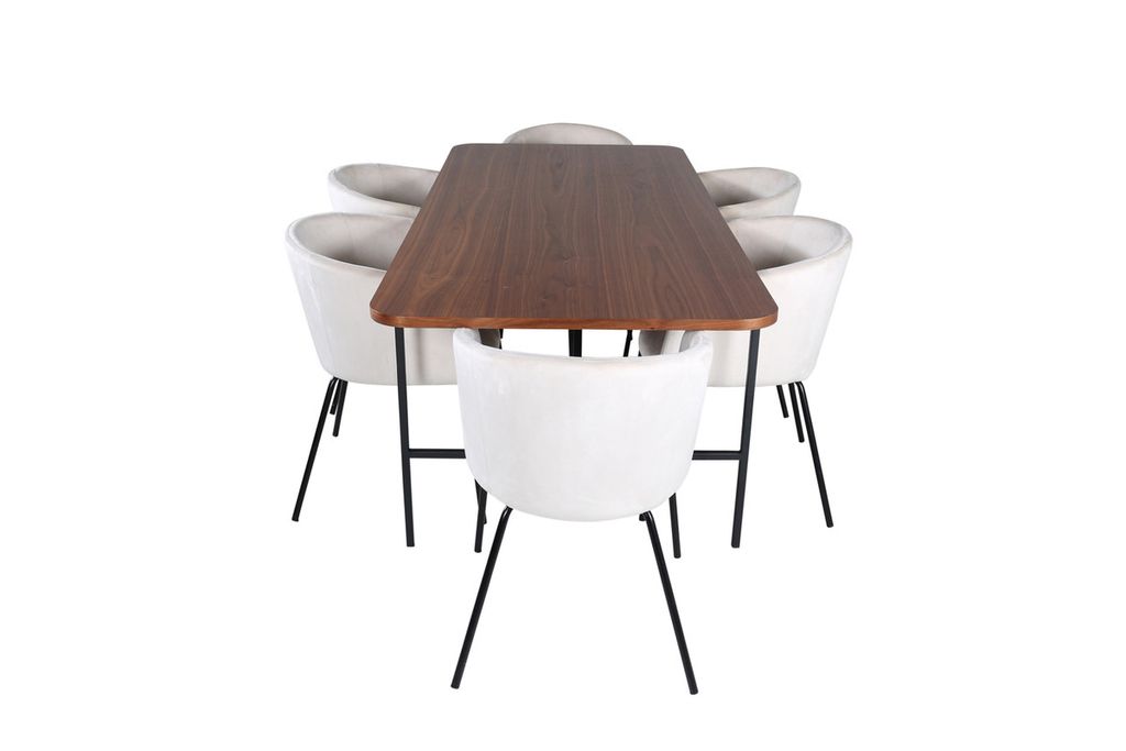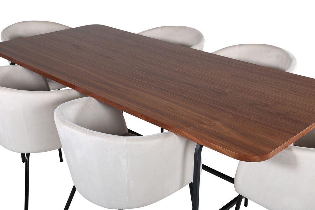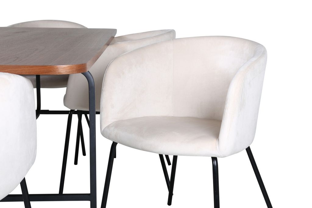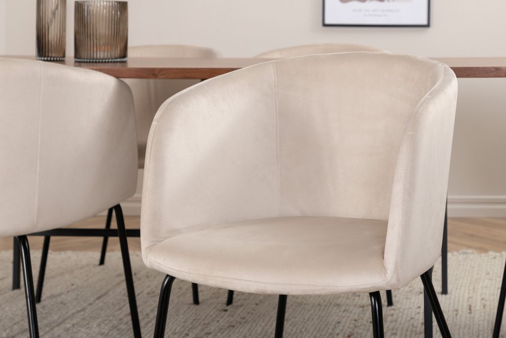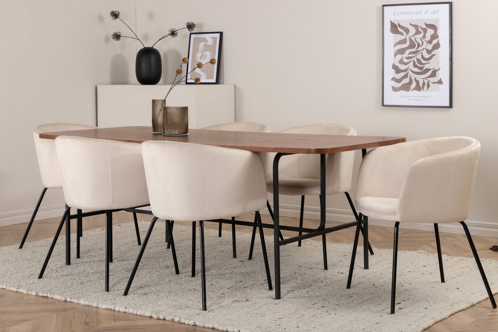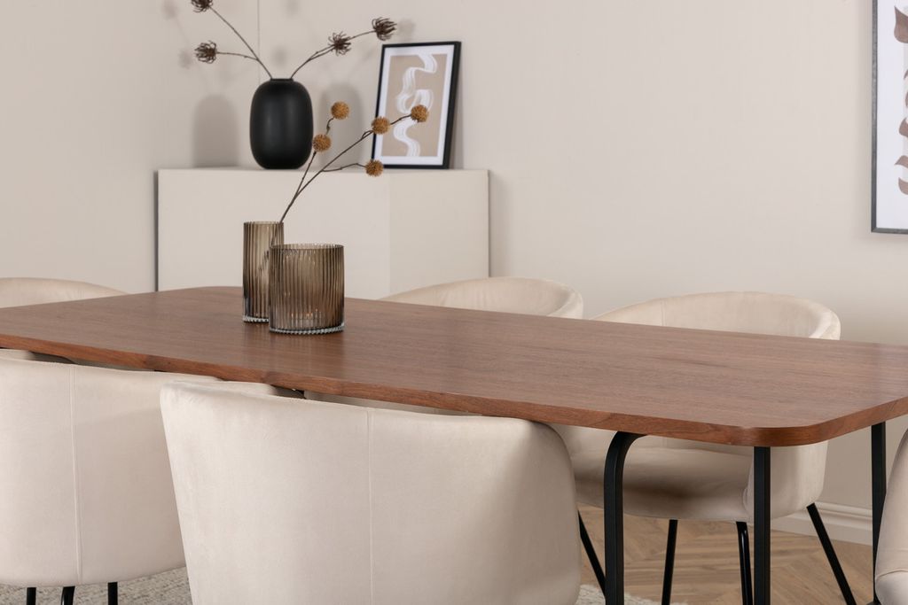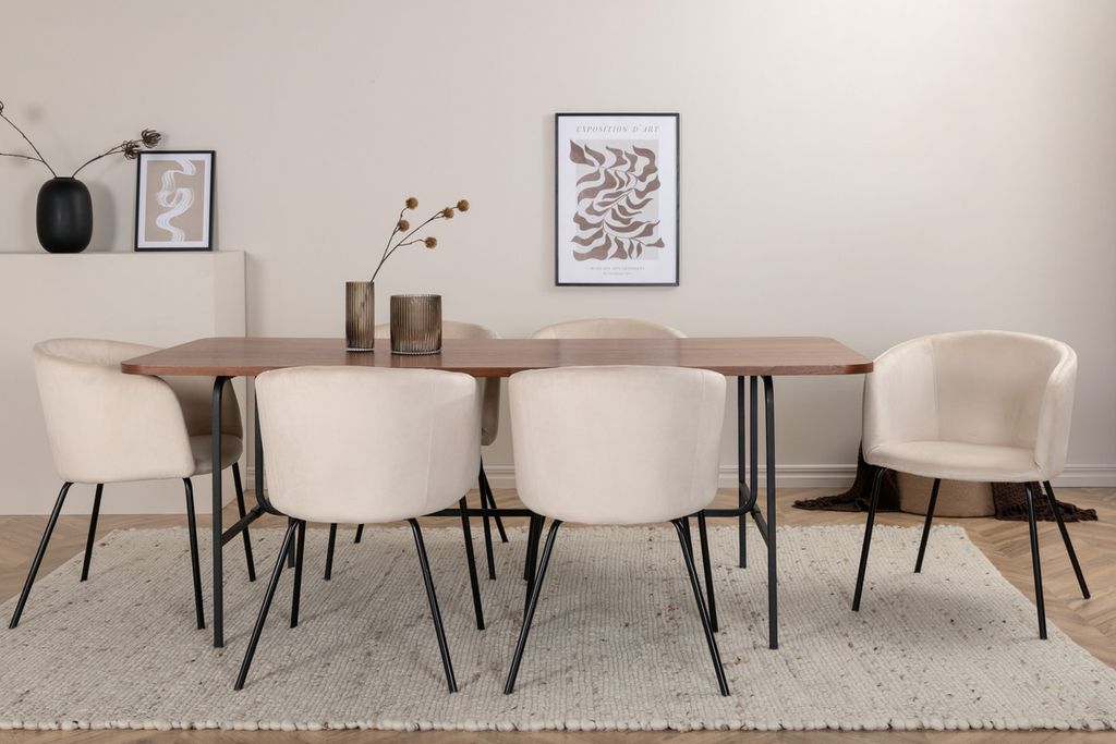 Vårt omtyckta matbord Uno är lika stilsäkert som tidlöst! Bordet är rektangulärt utformat med lätt rundade hörn, en toppskiva i valnötsfärgad MDF med faner samt stilrent underrede i svart metall. Bordets mått: Längd: 200cm, Bredd: 90cm, Höjd: 74cm. Här i perfekt kombination med 6st Berit matstolar i beige sammetstyg och stilrent smala stolsben i svart järn. Stolens mått: Höjd: 78cm, Sitthöjd: 49cm, Bredd: 55cm, Djup: 55cm. En matgrupp med fokus på komfort och elegans!