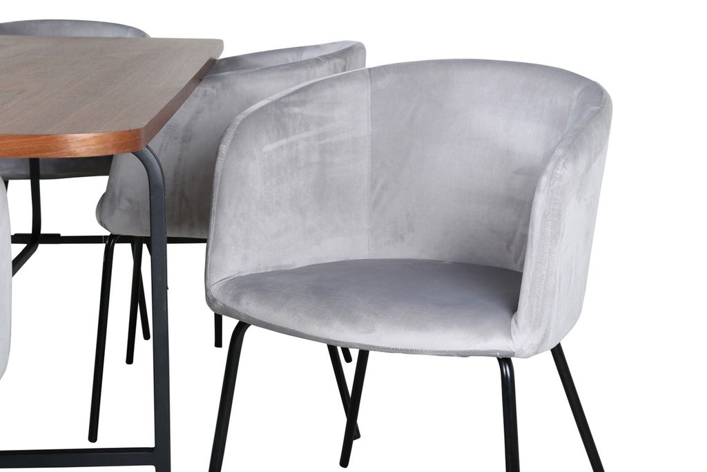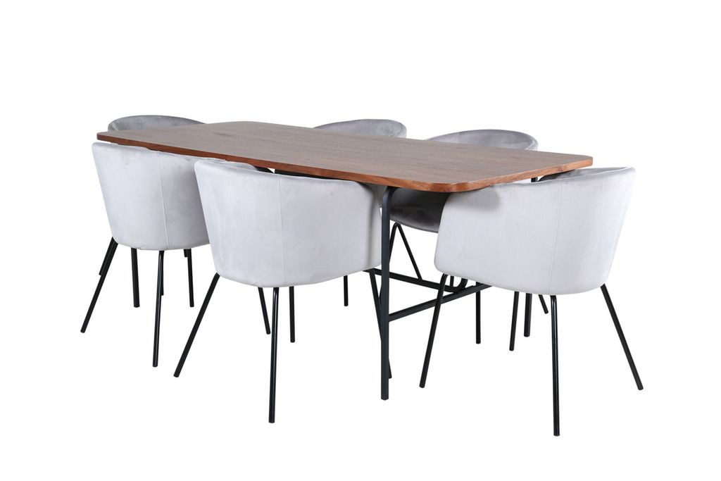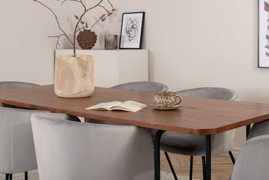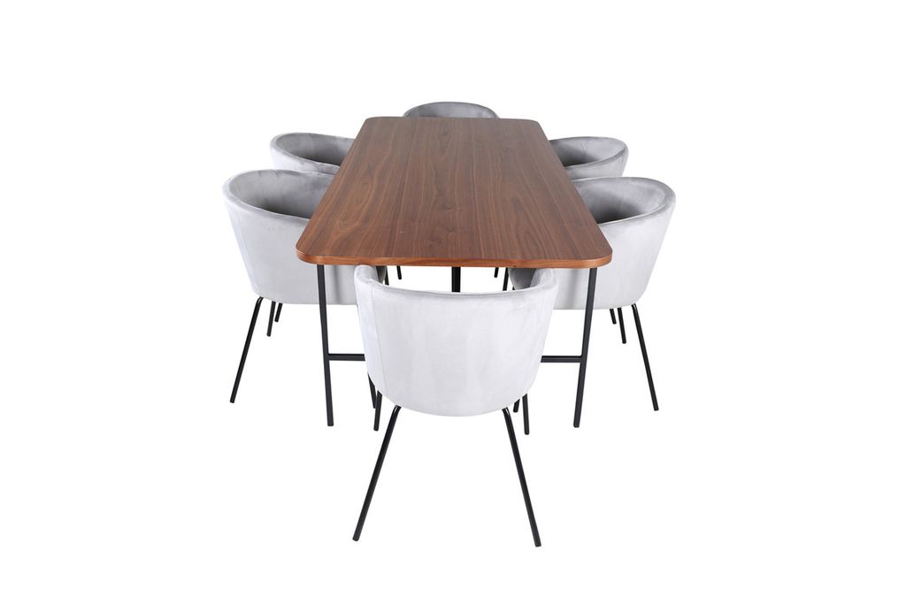 En matgrupp med fokus på komfort och elegans! Vårt omtyckta matbord Uno är lika stilsäkert som tidlöst. Bordet är rektangulärt utformat med lätt rundade hörn, en toppskiva i valnötsfärgad MDF med faner samt stilrent underrede i svart metall. Bordets mått: Längd: 200cm, Bredd: 90cm, Höjd: 74cm. Här i perfekt kombination med 6st Berit matstolar i ljusgrått sammetstyg och stilrent smala stolsben i svart järn. Stolens mått: Höjd: 78cm, Sitthöjd: 49cm, Bredd: 55cm, Djup: 55cm.