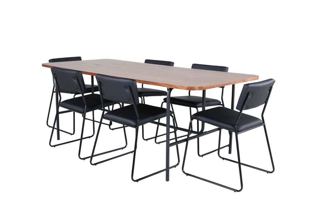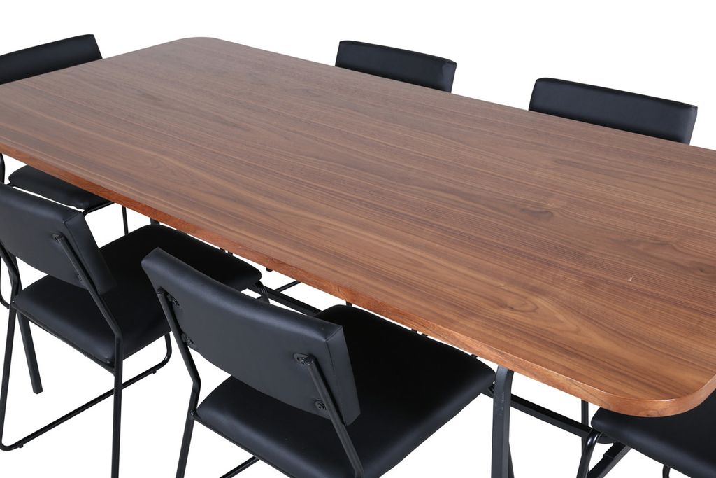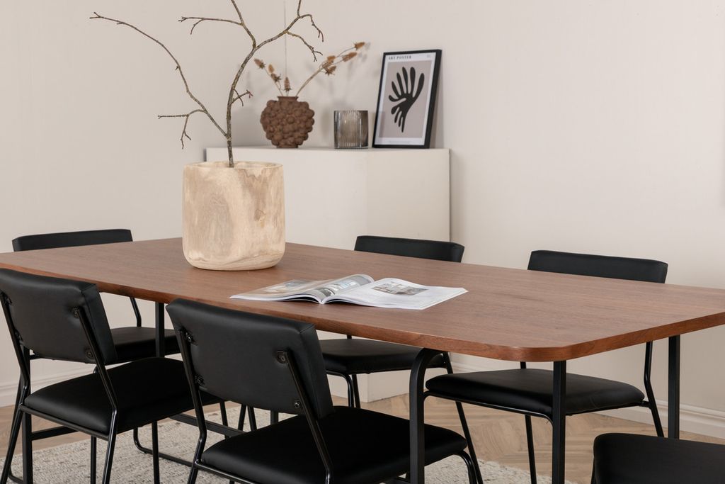 Stilren och luftig matgrupp för alla tillfällen - möblera vardagsrummet smart och inbjudande! Matbord Uno är rektangulärt utformat med lätt rundade hörn, en toppskiva i valnötsfärgad MDF med faner samt stilrent underrede i svart metall. Bordets mått: Längd: 200cm, Bredd: 90cm, Höjd: 74cm. Här i smäcker kombination med 6st Kenth matstolar i minimalistisk design. Stolsbenen är stilrent smala i svart järn och sitsarna i kaxigt svart konstläder. Stolens mått: Höjd: 76cm, Sitthöjd: 48,5cm, Bredd: 40cm, Djup: 52cm. Njut av trivsamma måltider framöver!