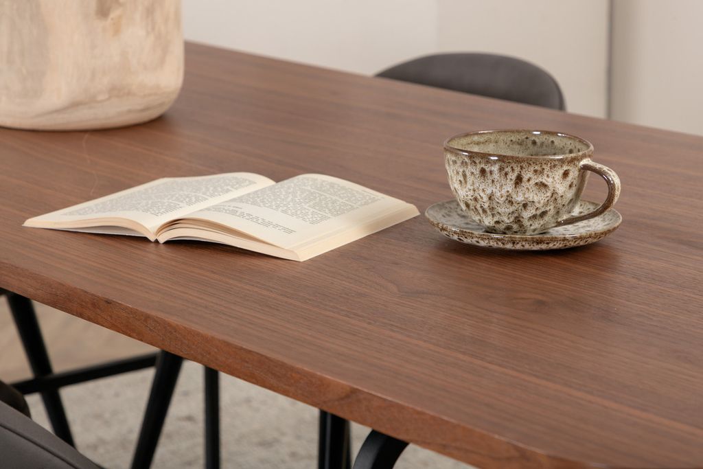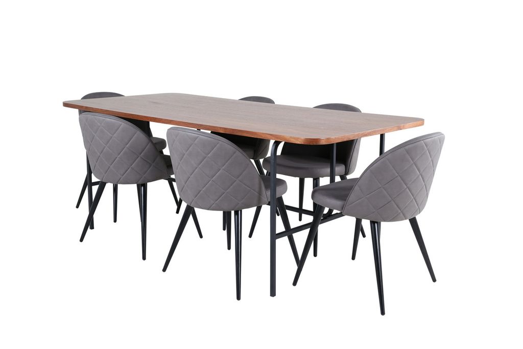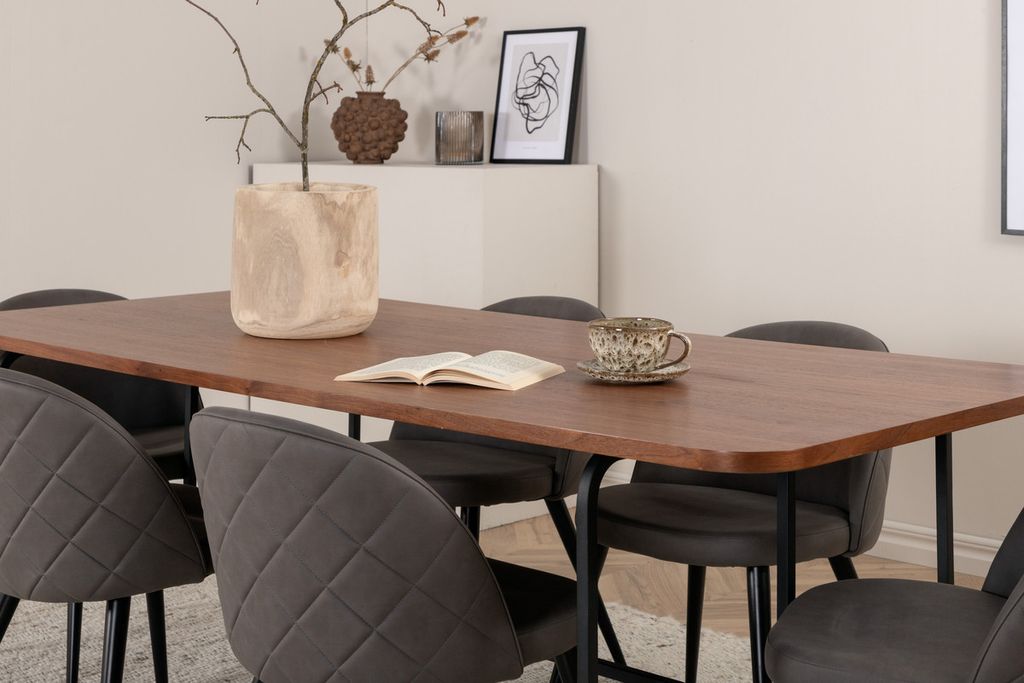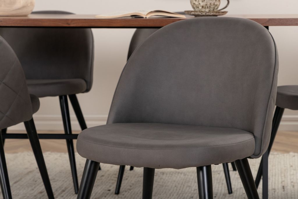 Med det klassiska och moderna matbordet Uno kan hela familjen samlas för middag och umgänge. Bordet är rektangulärt utformat med lätt rundade hörn, en toppskiva i valnötsfärgad MDF med faner samt stilrent underrede i svart metall. Bordets mått: Längd: 200cm, Bredd: 90cm, Höjd: 74cm. Matchas här med 6st Velvet Stitches matstolar med utsvängda, svarta stolsben i metall och gråa sitsar i mikrofiber med dekorsöm. Stolens mått: Höjd: 76,5cm, Sitthöjd: 46,5cm, Bredd: 50cm, Djup: 57cm. Låt dig inspireras av en iögonfallande matgrupp!