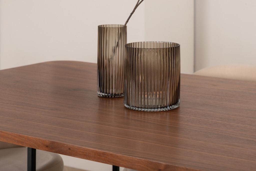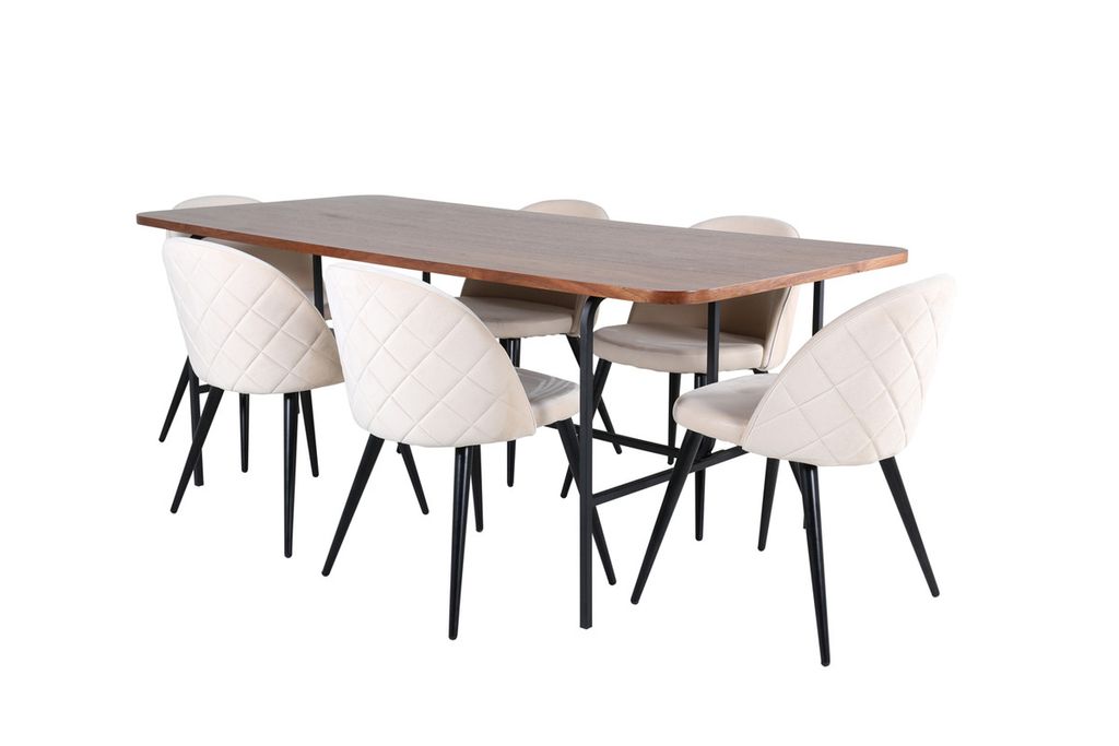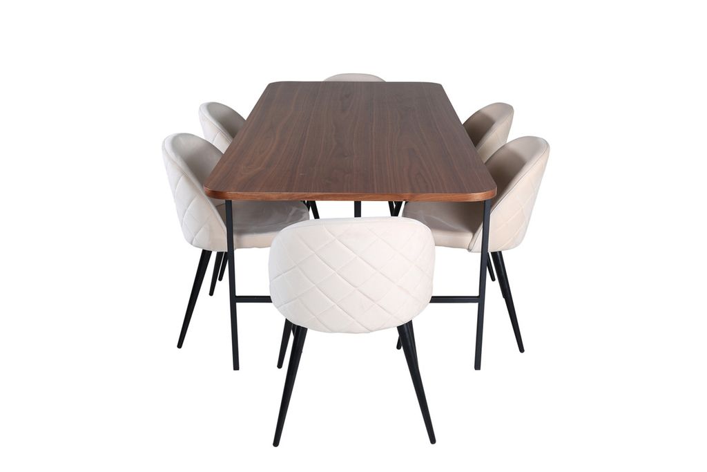 Med det klassiska och moderna matbordet Uno kan hela familjen samlas för middag och umgänge. Bordet är rektangulärt utformat med lätt rundade hörn, en toppskiva i valnötsfärgad MDF med faner samt stilrent underrede i svart metall. Bordets mått: Längd: 200cm, Bredd: 90cm, Höjd: 74cm. Matchas här med 6st Velvet Stitches matstolar med utsvängda, svarta stolsben i metall och sitsar i beige sammet med dekorsöm. Stolens mått: Höjd: 76,5cm, Sitthöjd: 46,5cm, Bredd: 50cm, Djup: 57cm. Låt dig inspireras av en iögonfallande matgrupp!
