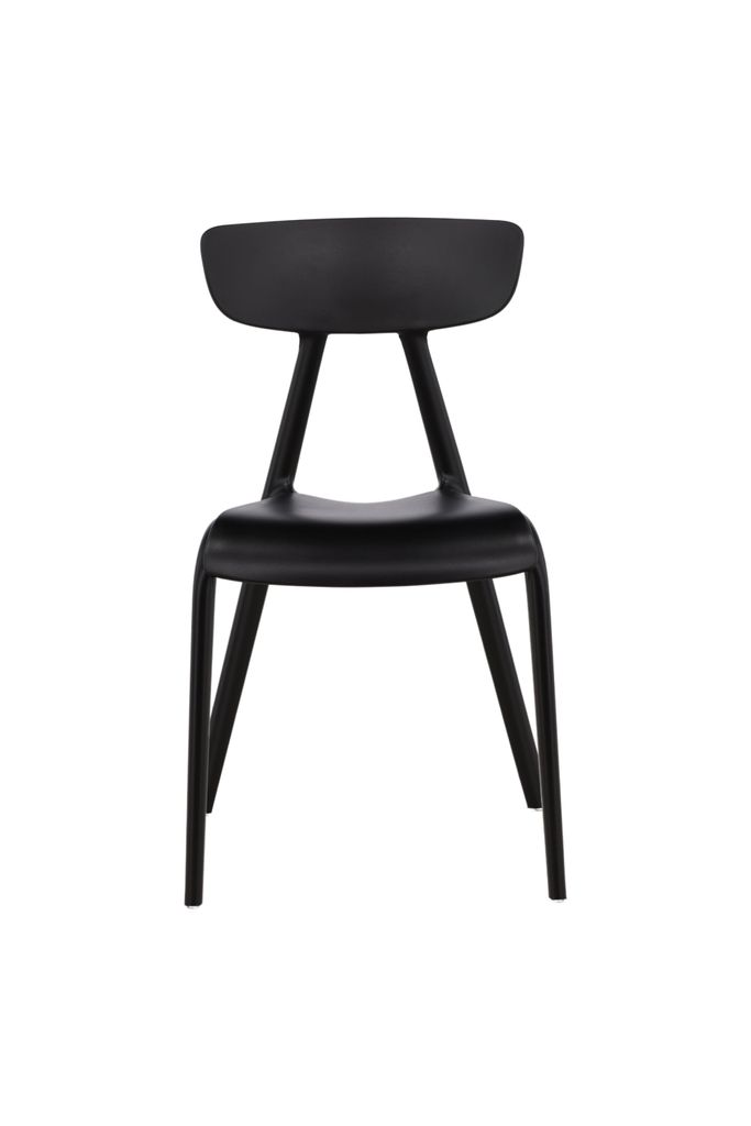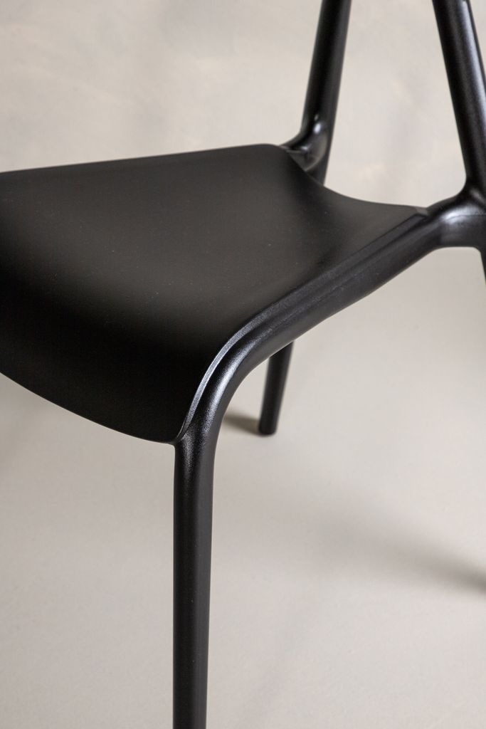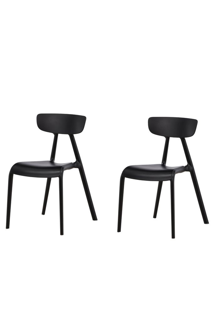 Stilrena matstolar i svart plast med skandinavisk design och lätt utsvängda ben. Perfekt för kök och vardagsrum.