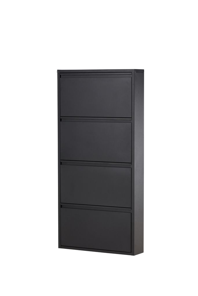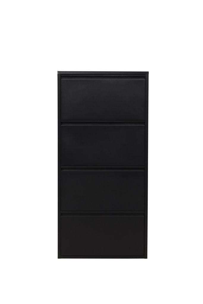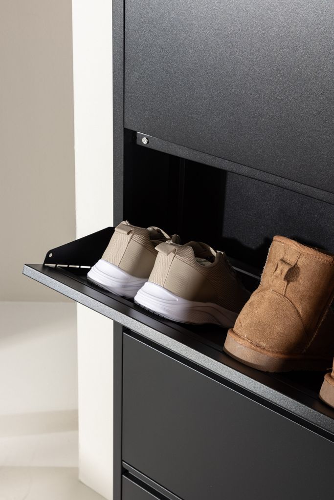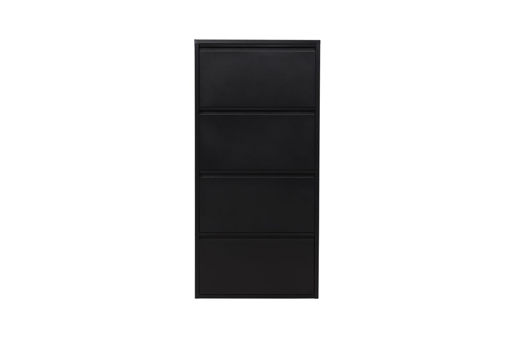 Stilren svart skoförvaring i metall med fyra luckor för en organiserad hall.