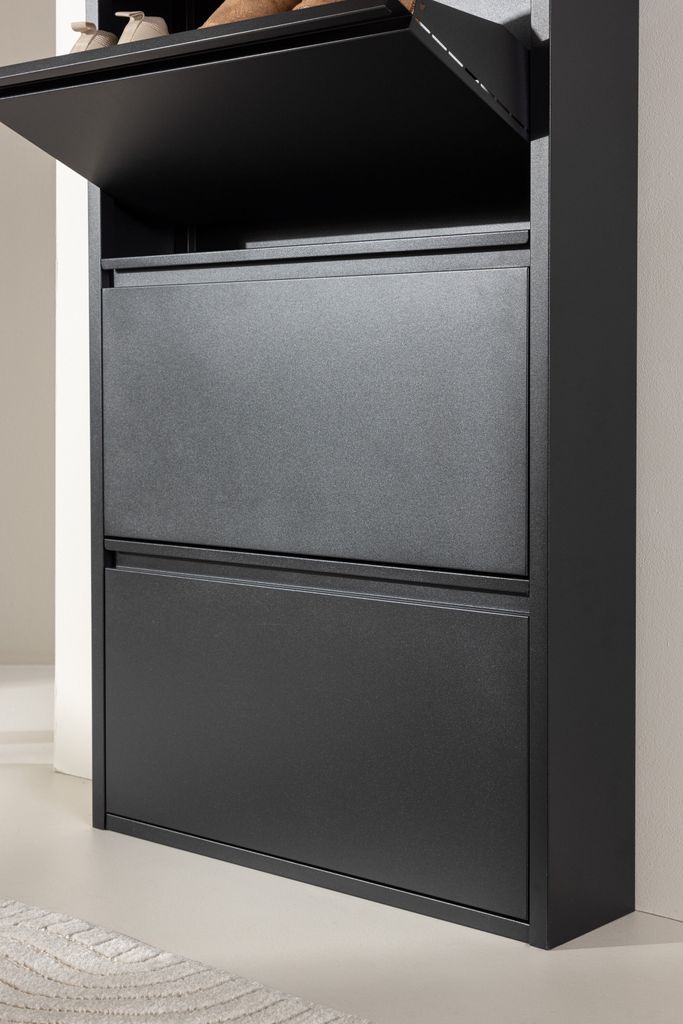 Den robusta konstruktionen i stål ger en modern och sofistikerad känsla, samtidigt som den svarta färgen tillför en tidlös elegans. Ushuaia är designad för att rymma flera par skor, och dess smala profil gör den idealisk även för mindre utrymmen.