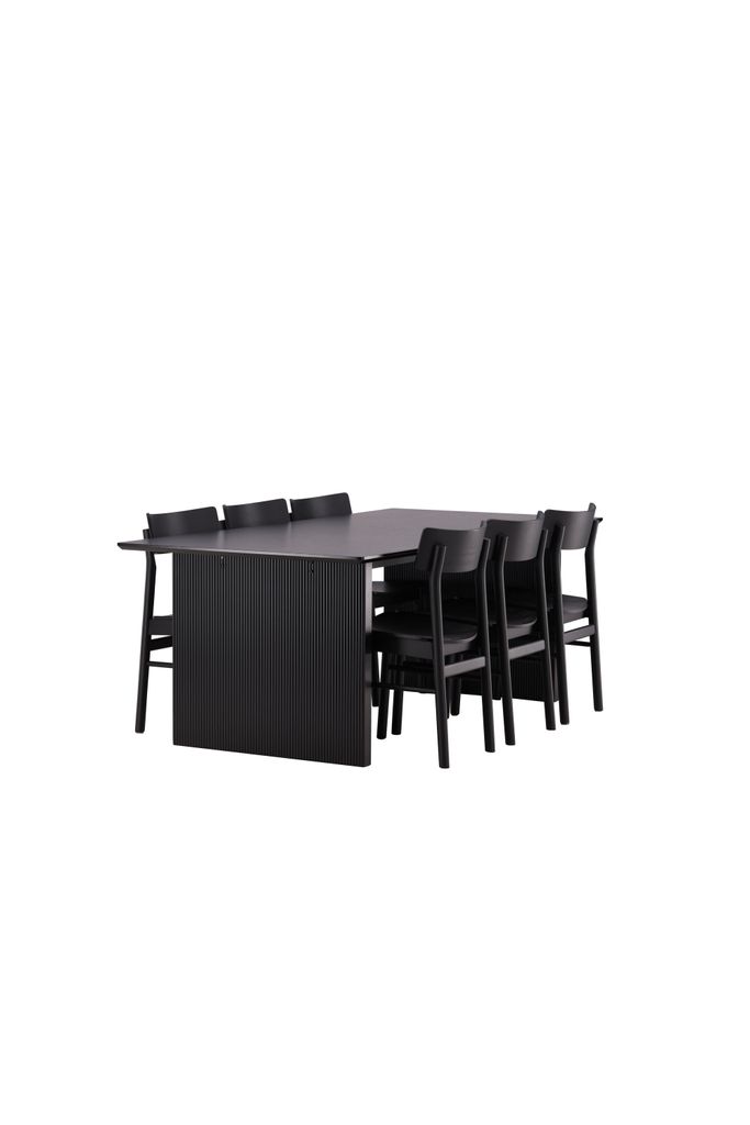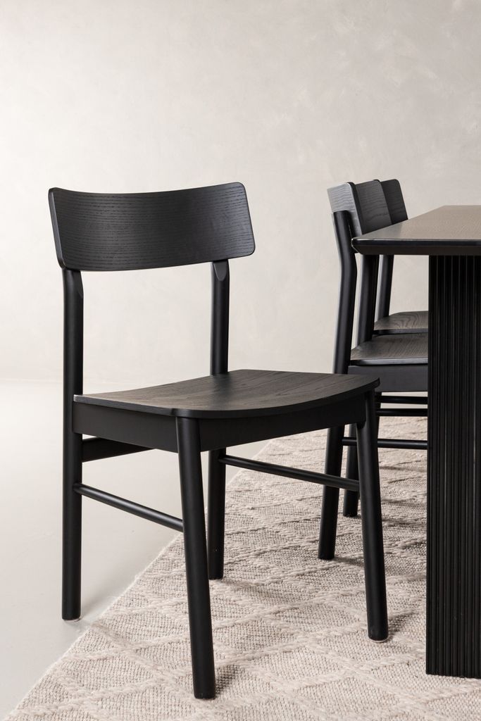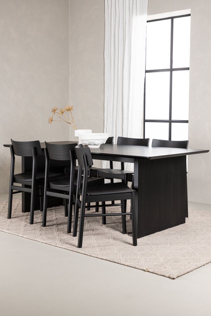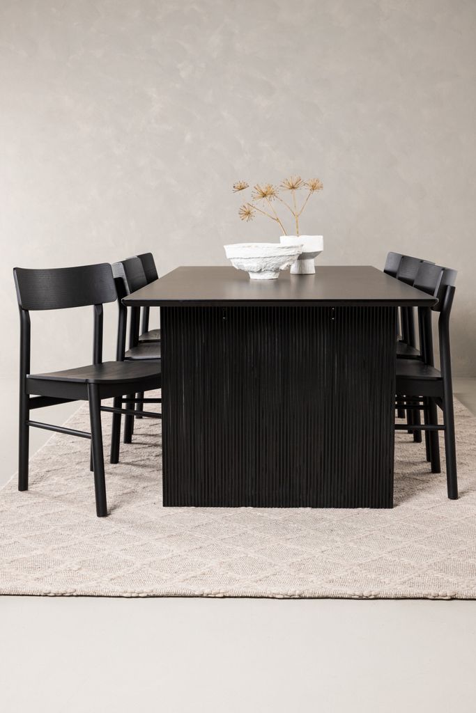 De medföljande Montros stolarna har en klassisk och nostalgisk design, också i svart, tillverkade i gummiträ som ger en robust och inbjudande känsla. Möblemanget bjuder in till stilfulla middagar och passar perfekt i både moderna och traditionella hem.