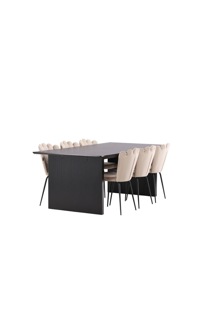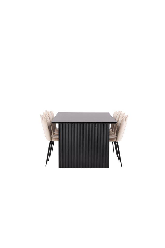 Elegant matgrupp med sotigt svart bord i MDF och lyxiga beige stolar i sammet. Perfekt för stilfulla middagar.