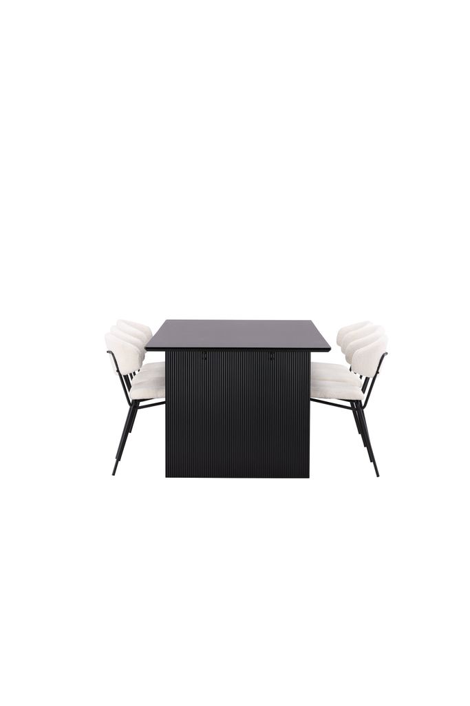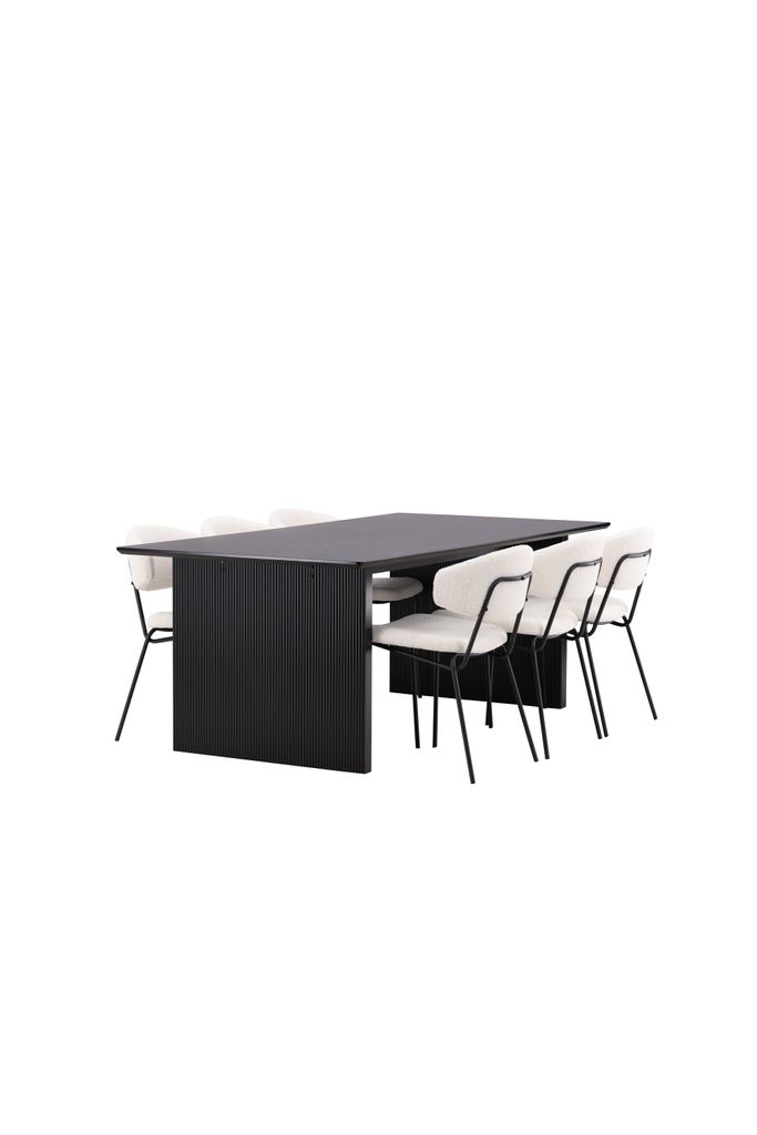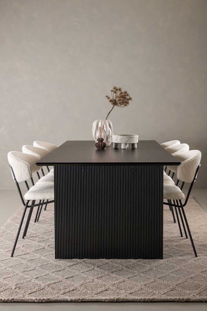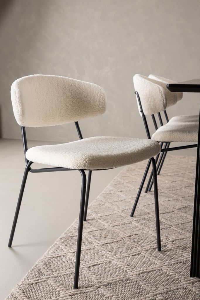 Matstolarna från serien Chico kompletterar bordet med sin minimalistiska design. De är klädda i ett mjukt vitt boucletyg som ger en inbjudande känsla, medan den smala stommen i svart stål ger en modern och stilren look.