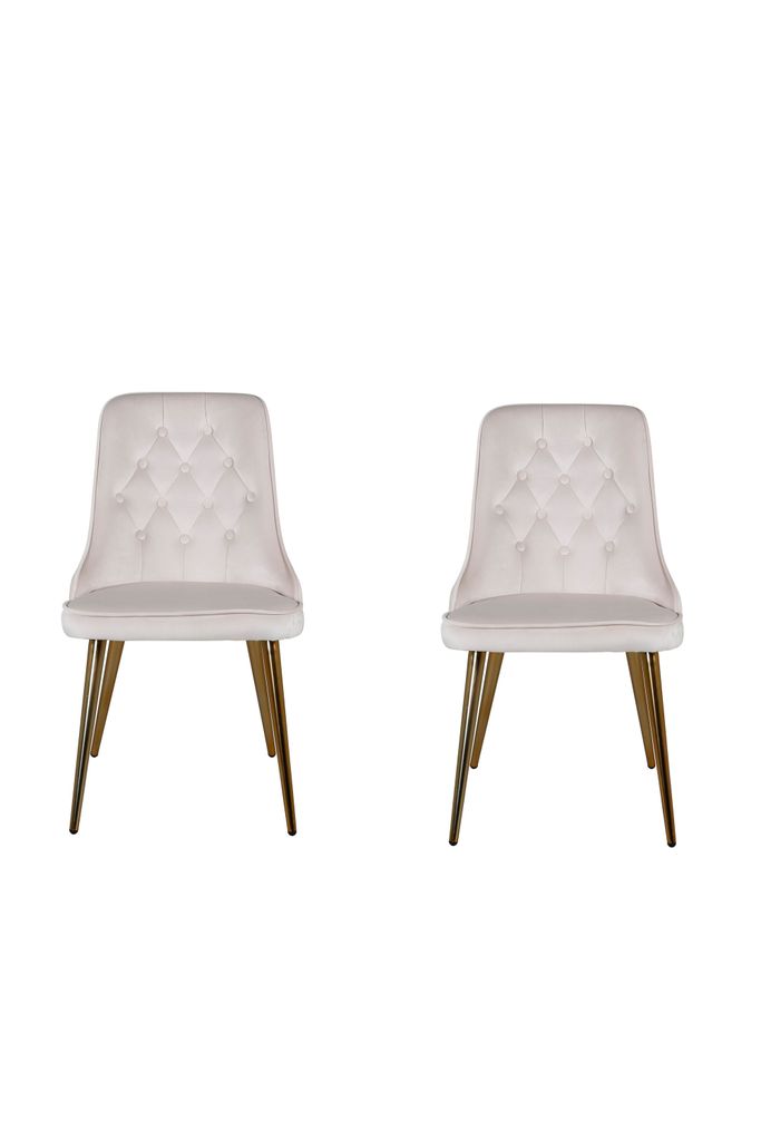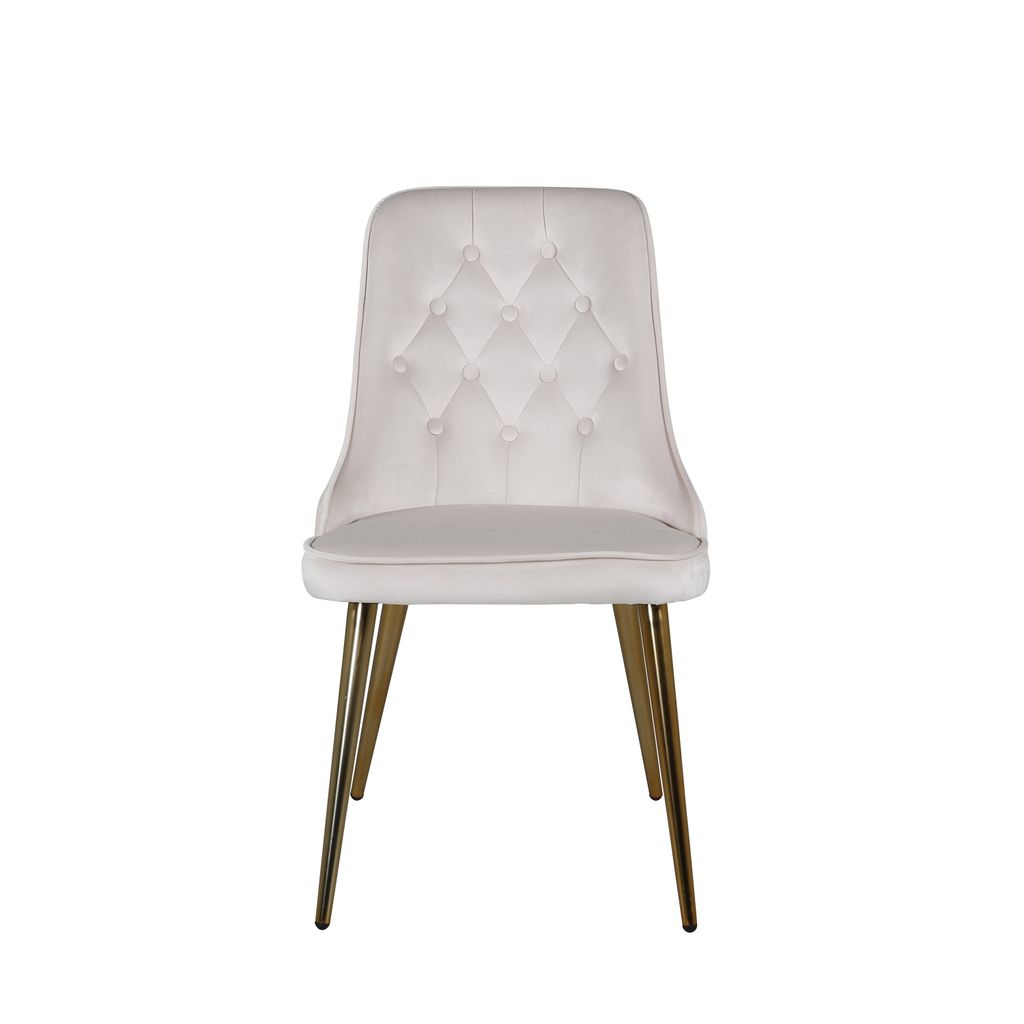 Uppgradera ditt vardagsrum med Venture Home Velvet Deluxe Matstol 2-pack. Dessa stolar är klädda i elegant krämvit sammet och pryds av dekorativa knappar och sömmar på ryggstödet, vilket ger ett sofistikerat intryck. De mässingsfolierade metallbenen bidrar med en touch av lyx och stabilitet.