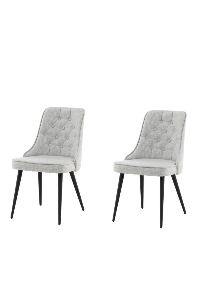 Elegant och bekväm matstol i grått polyestertyg med dekorativa knappar, svart metallben och mjuk stoppning. Perfekt för stilrena hem.