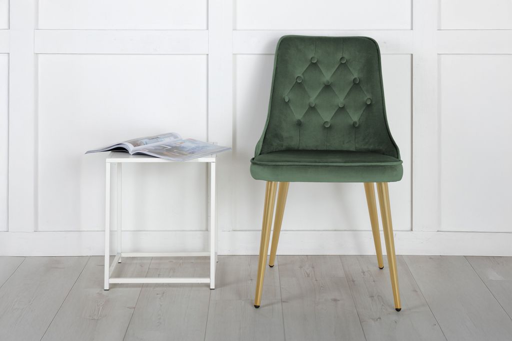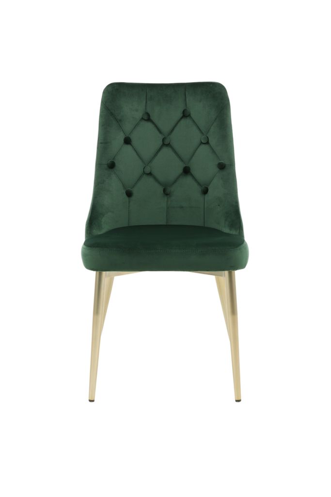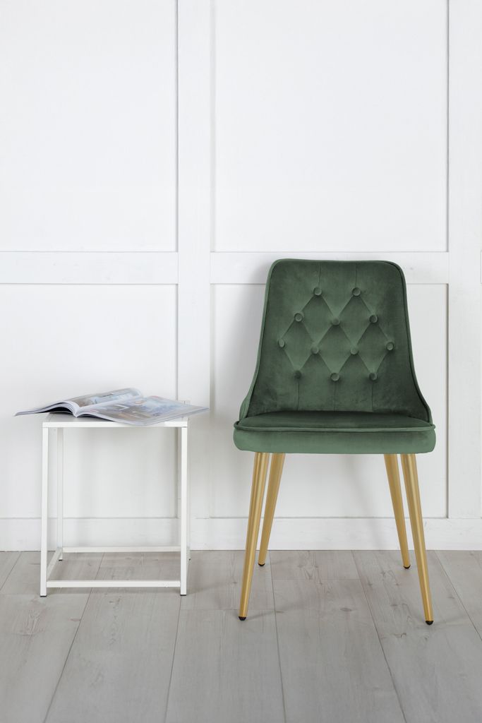 Elegant och bekväm skogsgrön matstol i sammet med mässingben, perfekt för en lyxig atmosfär.