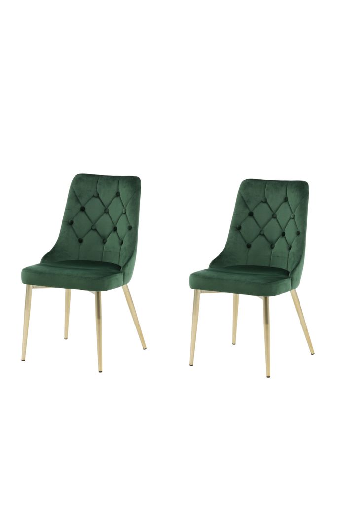 Stolarnas rundade rygg och sits med mjukt stoppade dekorativa knappar ger både komfort och stil. Den gröna sammeten kan skifta nyans beroende på ljuset, vilket bidrar till en elegant och unik look. Perfekt för både vardag och fest!