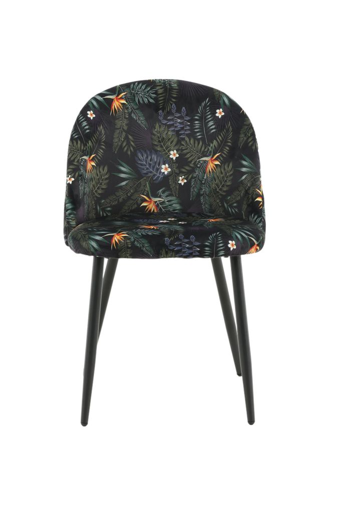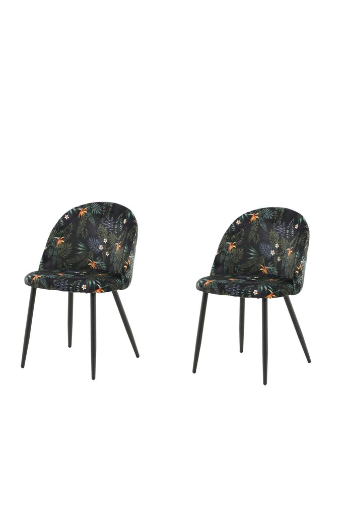 Den flerfärgade designen med tropiska blommönster mot en mörk bakgrund ger en exklusiv känsla och passar perfekt för både middagsbjudningar och vardagligt bruk. Med en sitthöjd på 43 cm och en bekväm sittbredd på 45 cm, är dessa stolar perfekta för alla bordshöjder.