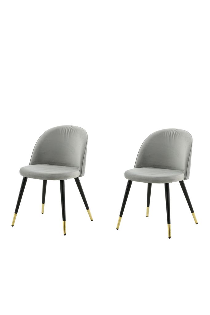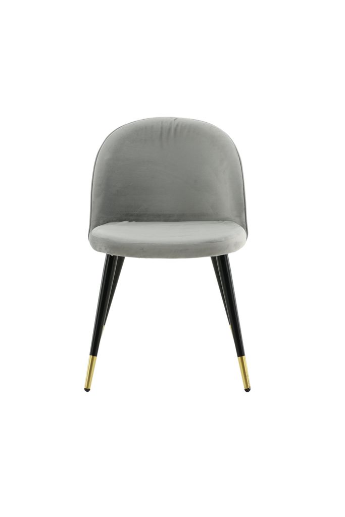 Elegant och tidlös matstol i ljusgrå sammet med ben i svart och mässingsdetaljer för en modern look.
