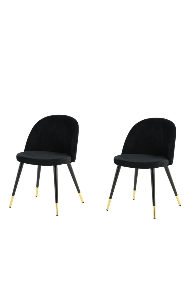 Upptäck Venture Home Velvet Matstol 2-pack – en kombination av elegans och komfort för ditt matrum. Dessa stolar har en helklädd design i svart sammet, vilket ger en lyxig känsla. Benen är tillverkade av svart pulverlackerad metall med moderna benslut i mässingsfoliering, som ger en sofistikerad touch.
