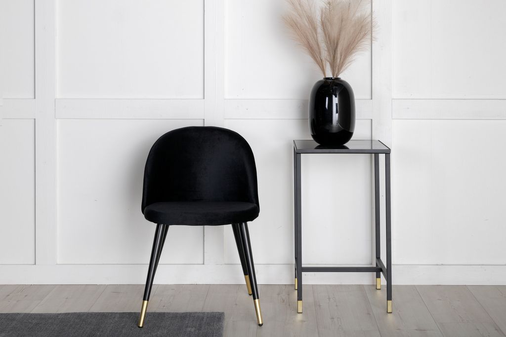 Elegant sammetstol från Venture Home med svart och mässingsdetaljer. Bekväm och stilren design.